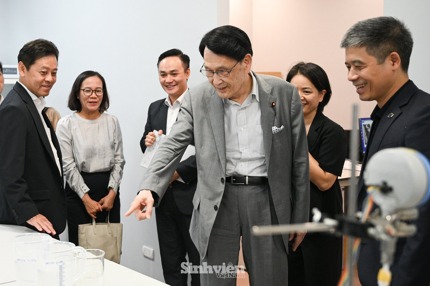 | Ông Tokai Kisaburo - Chủ tịch Ban nghiên cứu chính sách, Nghị sĩ Hạ viện Nhật Bản và PGS. TS Hoàng Tùng - Hiệu trưởng Trường Đại học Xây dựng Hà Nội (từ phải qua) cùng đoàn công tác tham quan phòng thí nghiệm thuộc Dự án SATREPS. |