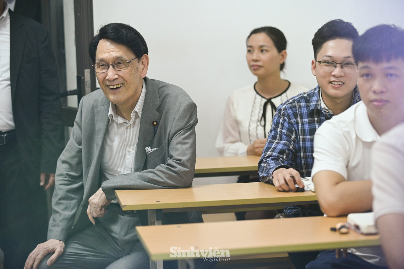 | Ông Tokai Kisaburo và đoàn công tác giao lưu cùng sinh viên tại lớp học tiếng Nhật của Viện Công nghệ cao Việt Nhật. |