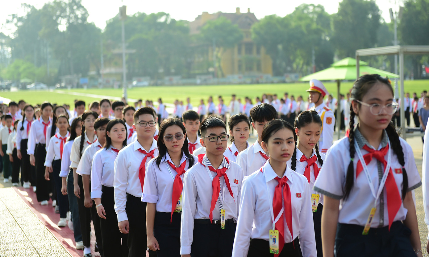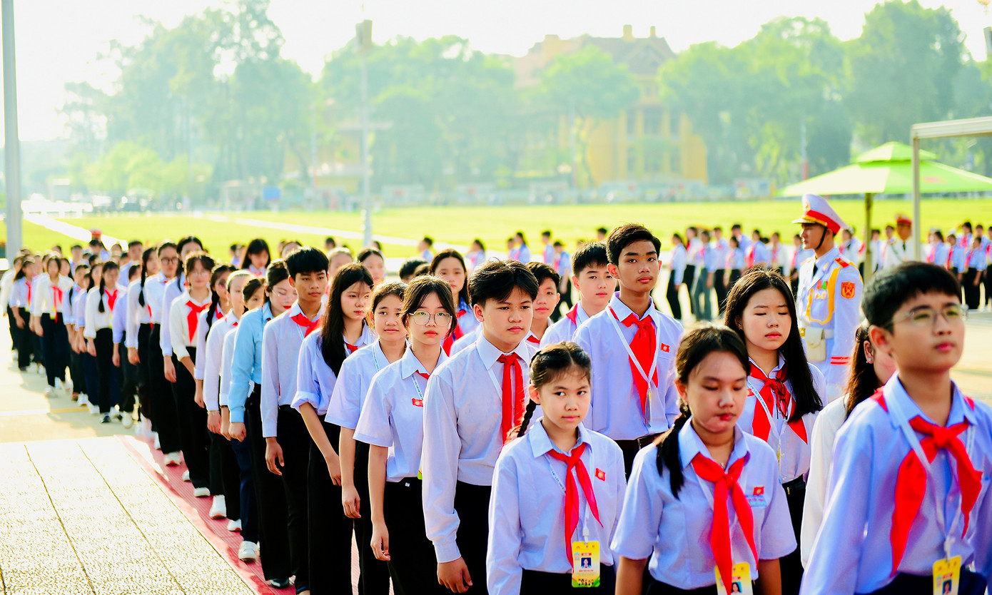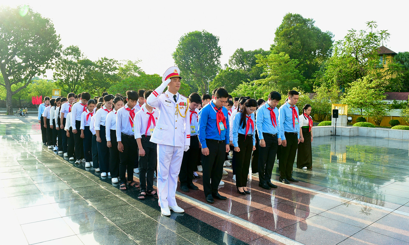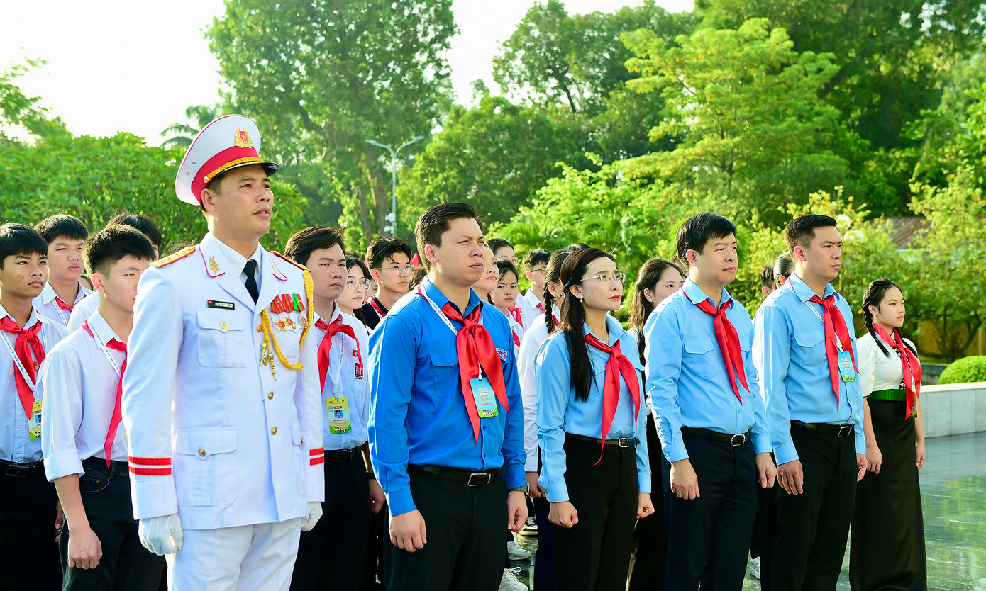 Các đồng chí lãnh đạo T.Ư Đoàn, Thường trực Hội đồng Đội Trung ương và các đại biểu Phiên họp giả định "Quốc hội trẻ em" lần thứ II, năm 2024 thành kính đặt vòng hoa mang dòng chữ "Đời đời nhớ ơn Chủ tịch Hồ Chí Minh" và vào Lăng viếng Chủ tịch Hồ Chí Minh.