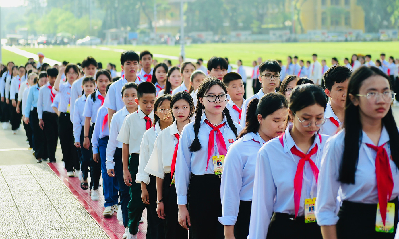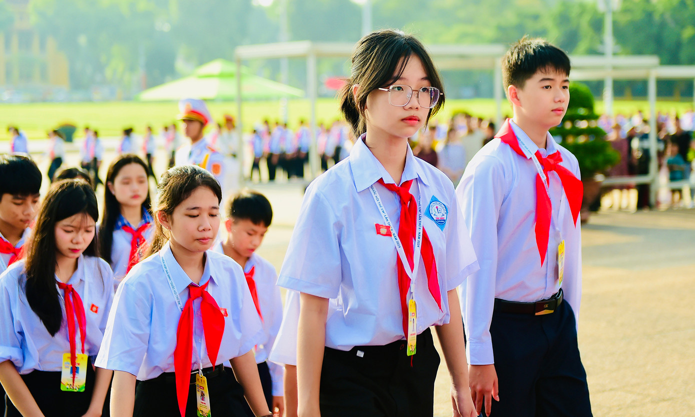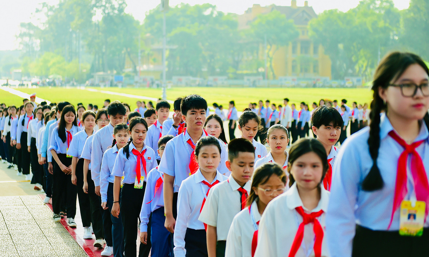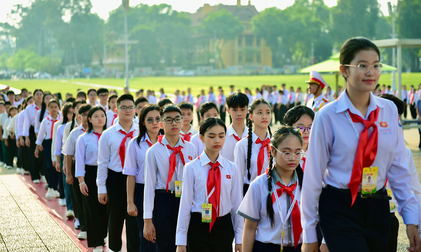 Các đồng chí lãnh đạo T.Ư Đoàn, Thường trực Hội đồng Đội Trung ương và các đại biểu Phiên họp giả định "Quốc hội trẻ em" lần thứ II, năm 2024 thành kính đặt vòng hoa mang dòng chữ "Đời đời nhớ ơn Chủ tịch Hồ Chí Minh" và vào Lăng viếng Chủ tịch Hồ Chí Minh.