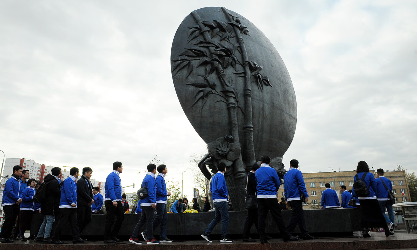 Lễ dâng hoa tại Tượng đài Chủ tịch Hồ Chí Minh là hoạt động đầu tiên của đoàn ngay khi đến Matxcova để tham gia Diễn đàn.