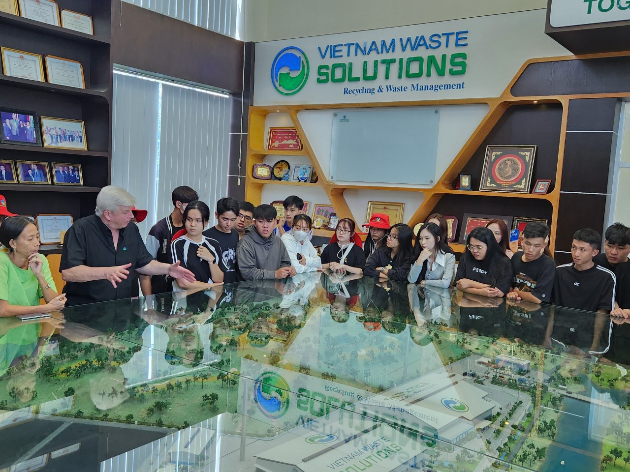 Chào đón đoàn sinh viên, ông Kevin Moore, Giám đốc điều hành Công ty VWS đã giới thiệu về quá trình thành lập và quy trình xử lý chất thải tại Khu liên hợp xử lý chất thải Đa Phước (huyện Bình Chánh, TPHCM) như: nhà máy xử lý nước rỉ rác, nhà máy thu và phát điện từ khí gas của bãi chôn lấp, nhà máy tái chế...