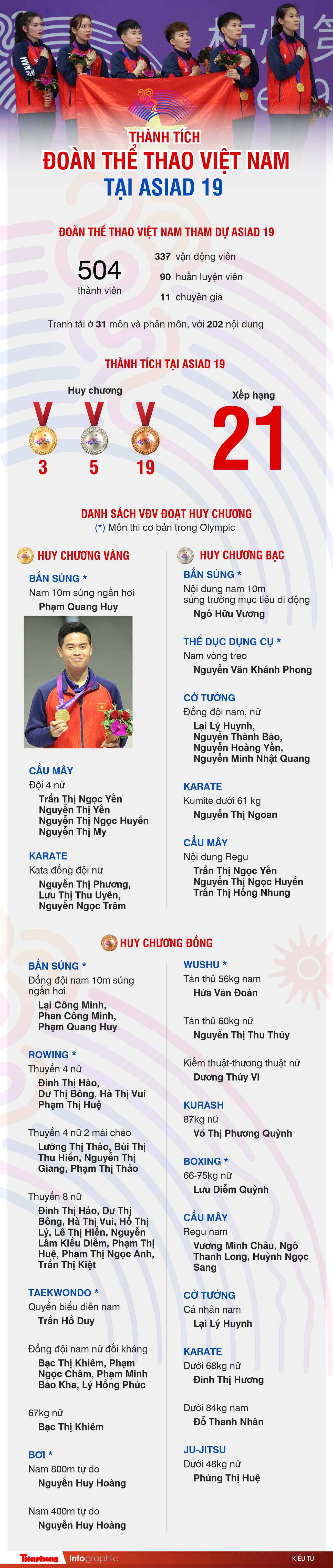 TPO - Kết thúc Asiad 19, Đoàn Thể thao Việt Nam giành được 27 huy chương, gồm 3 Huy chương Vàng, 5 Huy chương Bạc và 19 Huy chương Đồng, xếp thứ 21 trên bảng tổng sắp.