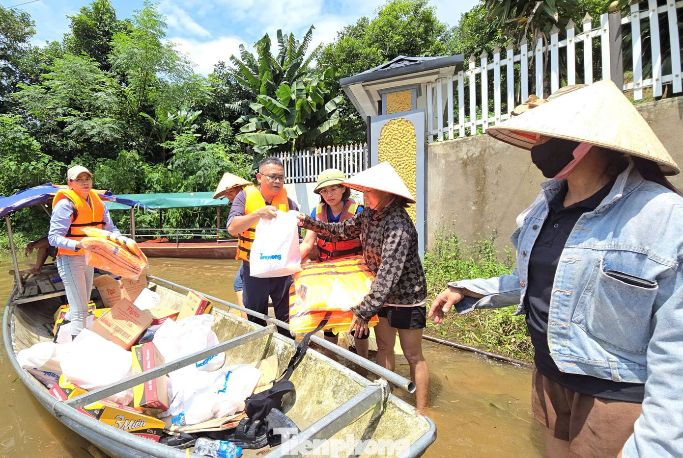 Bà Nguyễn Thị Oanh (65 tuổi) chia sẻ, nước lũ dâng cao quá nhanh khiến bà không kịp xoay xở. Tổng khoảng 70 con gà, vịt, ngan cùng nhiều vật dụng trong nhà đều bị cuốn trôi, hư hỏng. "Nhà tôi giờ vẫn ngập quá nửa, phải trú nhờ nhà người thân. Bị nước cô lập, thiếu thốn đủ thứ, được đoàn công tác tặng quà, chúng tôi rất mừng, cảm ơn các nhà hảo tâm, mạnh thường quân", bà Oanh nói.