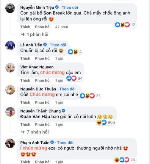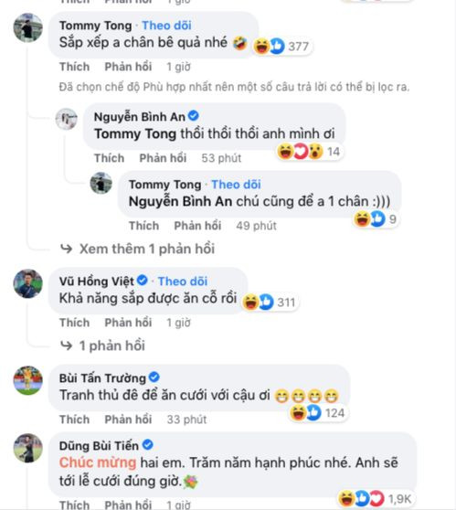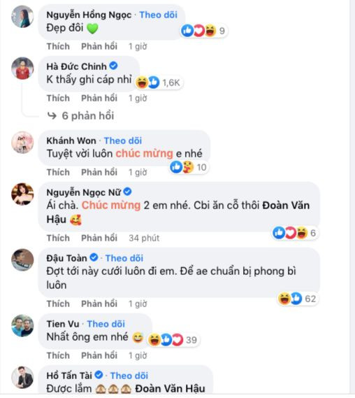 Diễn viên Bảo Hân viết: “Thời gian, địa điểm rõ ràng ở đâu ấy nhỉ hai bác”. “Hi vọng anh vẫn có trong đầu em và vinh hạnh khi được thiệp của em mời Đoàn Văn Hậu”- cầu thủ Tiến Linh nhắn nhủ. Thủ môn Bùi Tiến Dũng để lại bình luận: “Chúc mừng hai em. Trăm năm hạnh phúc nhé. Anh sẽ tới lễ cưới đúng giờ”.
