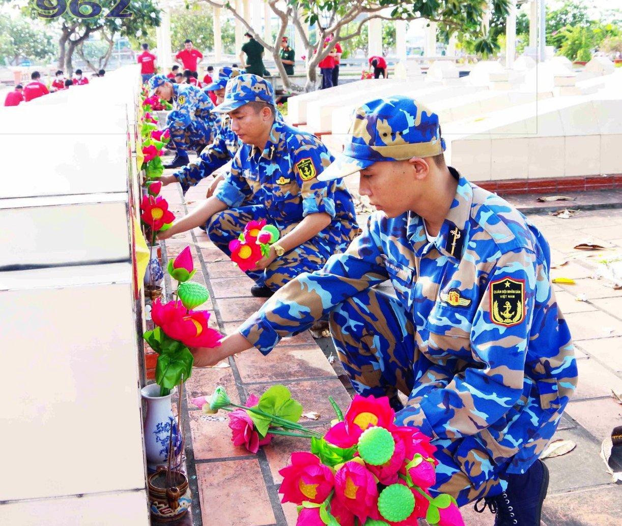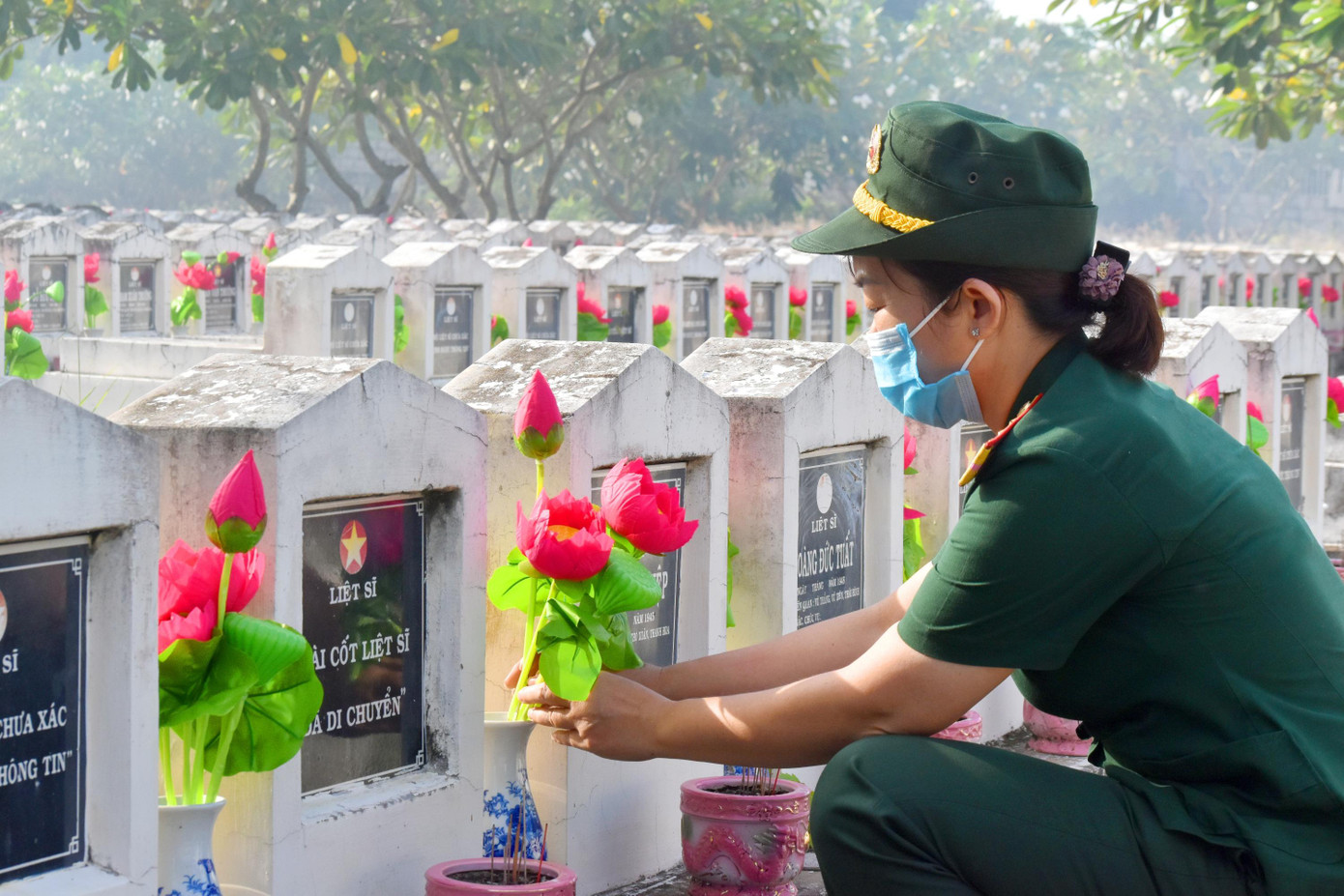 | Đoàn viên thanh niên An Giang thay hoa tại nghĩa trang liệt sỹ. - Ảnh: TĐ AG |