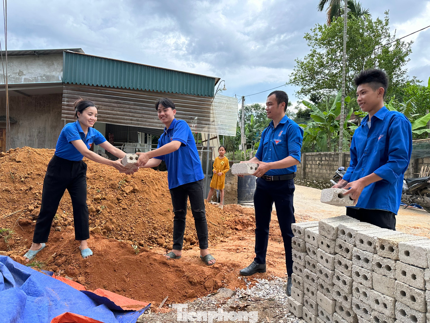 | Ngoài hỗ trợ gạch xây nhà, đoàn viên thanh niên còn hỗ trợ ngày công, san lấp móng nhà. |