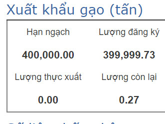 Theo ghi nhận của Tiền Phong, đến trưa nay 15/4, cập nhật của Tổng cục Hải quan trên cổng thông tin, lượng gạo đăng ký mở tờ khai đang ở mức 399.999,73 tấn, còn thiếu 27 tạ gạo. Lượng thực xuất theo trạng thái kiểm tra vẫn là con số 0.
