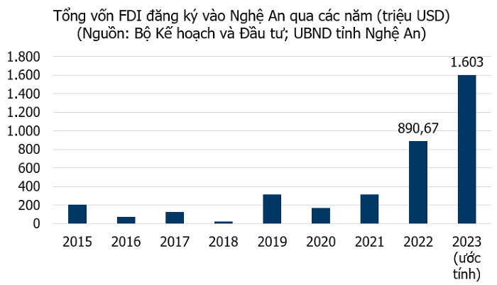Thông tin thêm về tình hình thu hút đầu tư nước ngoài, Trưởng ban quản lý Khu Kinh tế Đông Nam Nghệ An Lê Tiến Trị cho biết, năm nay, tỉnh thu hút được 1,603 tỷ USD vốn FDI, tăng 66,8% so với năm 2022, xếp thứ 8 tỉnh, thành phố trên cả nước; trong đó thu hút vào địa bàn Khu Kinh tế Đông Nam đạt 1,595 tỷ USD.