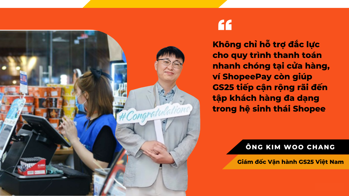 “Ngoài việc hỗ trợ nhân viên xử lý giao dịch nhanh chóng, tăng năng suất phục vụ khách hàng, nhất là trong những khung giờ cao điểm, ví ShopeePay còn giúp hệ thống có thêm lượt khách nhờ hưởng lợi từ tập khách hàng trong hệ sinh thái Shopee”, ông Kim Woo Chang - Giám đốc Vận hành GS25 Việt Nam cho biết. Xuất hiện tại hầu hết các địa điểm có nhu cầu mua sắm lớn như chung cư, văn phòng, trung tâm thương mại, bệnh viện, trường học, sự kết hợp của các cửa hàng tiện lợi như GS25 cùng các ví điện tử đang góp phần tạo nên cuộc “cách mạng” về thói quen thanh toán, giúp đời sống của người tiêu dùng trở nên dễ dàng và tiện lợi hơn chỉ qua một vài thao tác chạm trên thiết bị thông minh.