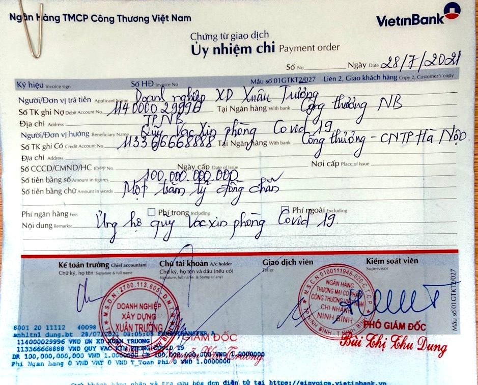 Do đang thực hiện giãn cách xã hội theo Chỉ thị 16 của Chính phủ và Chỉ thị số 17 của UBND TP Hà Nội, Doanh nghiệp Xây dựng Xuân Trường đã chuyển khoản ủng hộ vào Tài khoản Quỹ vắc xin phòng COVID-19 mở tại Ngân hàng TMCP Công Thương Việt Nam Chi nhánh Ninh Bình với số tiền 100 tỷ đồng.