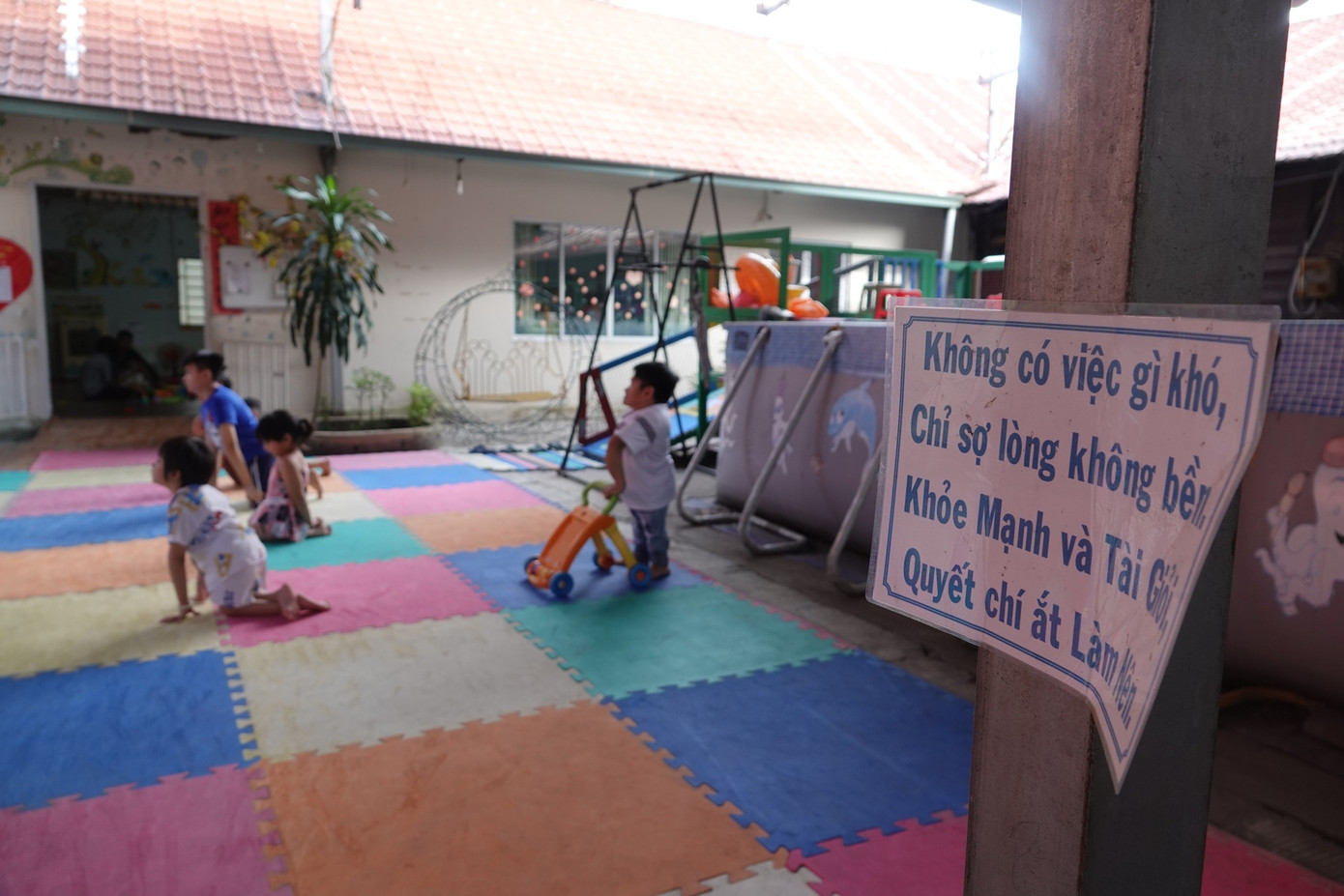 Nằm ở ngoại ô TPHCM, trung tâm Kim cương tươi đẹp (quận 12) như một chốn yên tĩnh bên lề thành phố sôi động. Chốc lát, lại có tiếng cười nói của trẻ con.