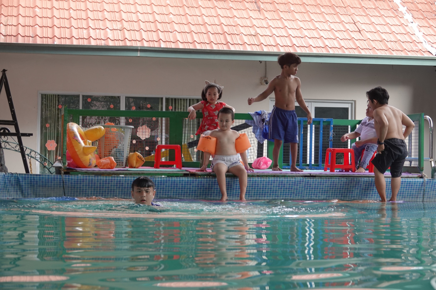 Đến giờ học bơi, những đứa trẻ đứng xếp hàng ngay ngắn, rồi lần lượt nhảy xuống hồ. Một số phụ huynh đứng xung quanh, bất ngờ khi con mình có thể đến được bờ bên kia hồ.