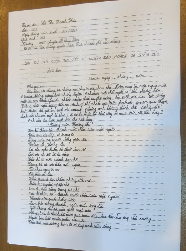 Chúng tôi xin giới thiệu nguyên văn “bức thư” - bài thi đạt giải Nhất cuộc thi “Viết về huyện đảo Hoàng Sa thân yêu” của em Hồ Thị Thanh Thảo: