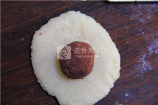 Cán mỏng hỗn hợp sắn rồi cho nhân khoai vào giữa. Nhẹ nhàng bọc vỏ sắn với nhân khoai lang rồi cho vào khuôn bánh trung thu chống dính.
