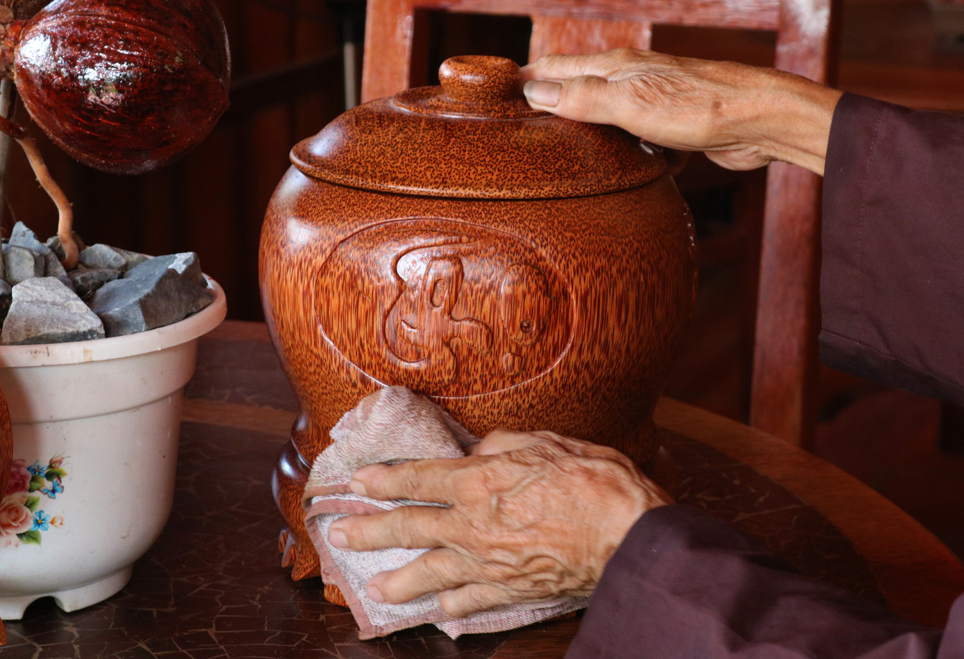 Chiếc tủ thờ được cẩn bằng gáo dừa thay vì cẩn ốc xà cừ đối với những loại tủ khác - Ảnh: Kim Hà.