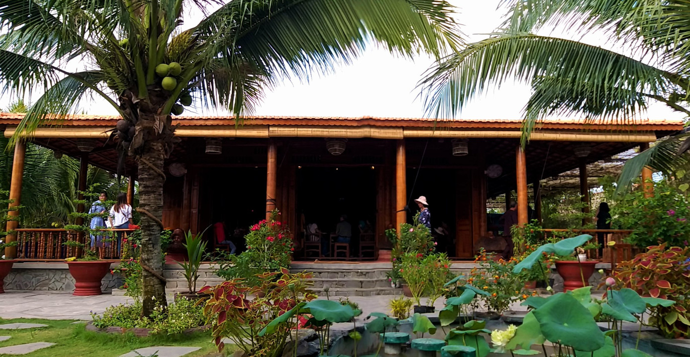 Ngôi nhà được làm hoàn toàn bằng gỗ dừa từ 80 - 100 năm tuổi - Ảnh: Kim Hà. Được bao bọc bởi không gian xanh mát với những hàng dừa và vườn cây ăn trái ở xứ cù lao. Ngôi nhà dừa được xây dựng trên diện tích rộng 4.000m2, với khoảng 4.000 cây gỗ dừa từ 80 – 100 năm tuổi không còn khả năng cho trái, được tìm mua từ Bến Tre và các nơi ở Vĩnh Long mang về.