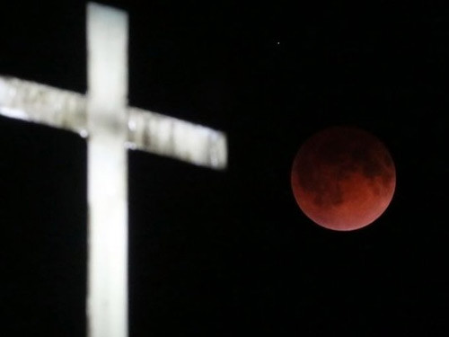 "Trăng máu" và cây thánh giá ở nhà thờ St. Olaf Lutheran, TP Ashippun, Wisconsin (Mỹ) Ảnh: AP