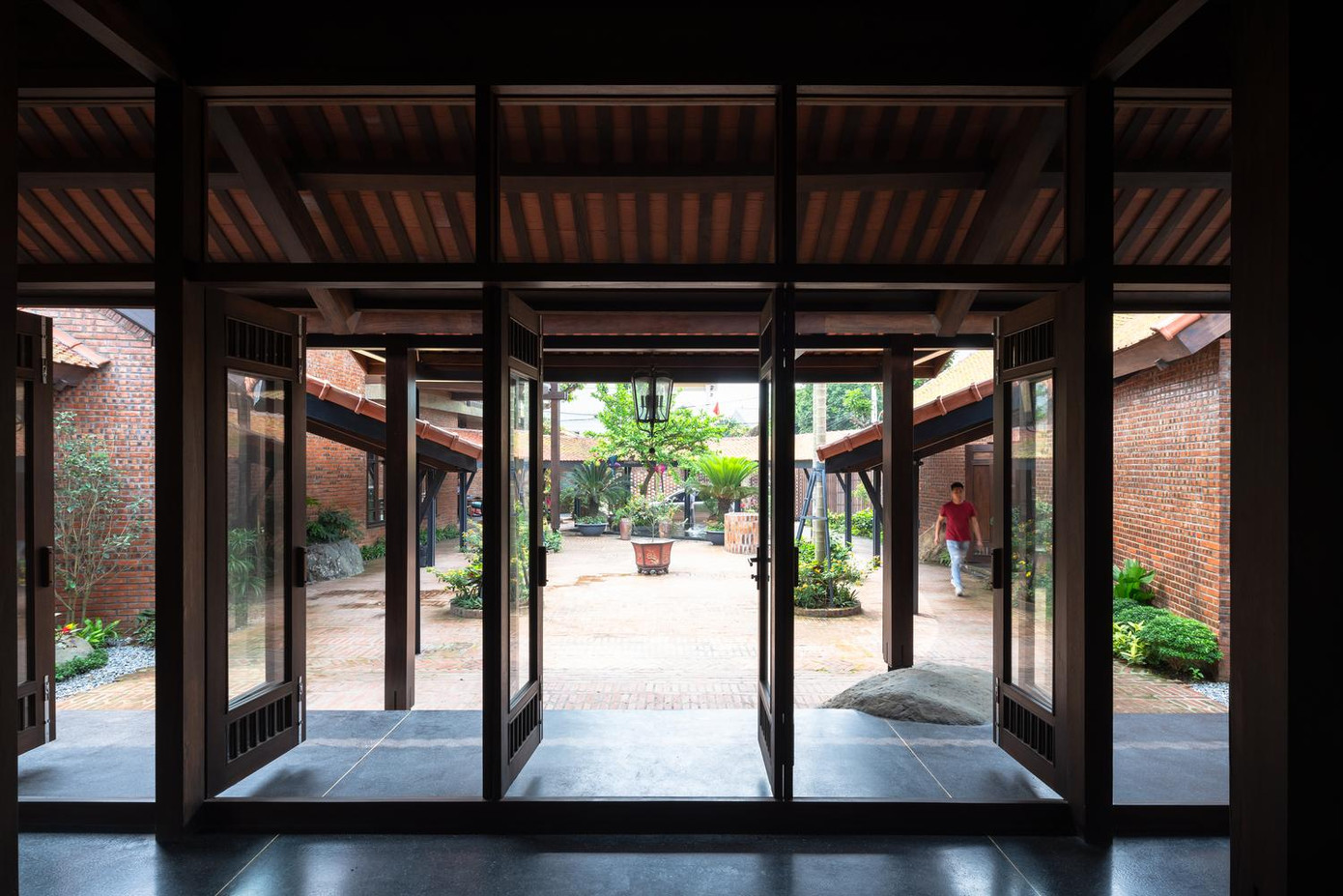 | Sân giữa và hàng hiên thoáng sáng giúp kết nối chặt chẽ các khối nhà với nhau. |