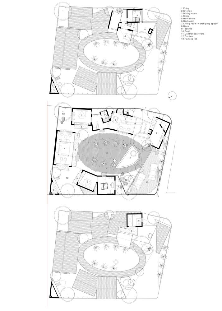 | Phòng bố mẹ ở phía bên kia sân trong khi phòng các cháu "nhô lên" trên khu vực bếp với hình khối, cốt nền chênh nhau. |