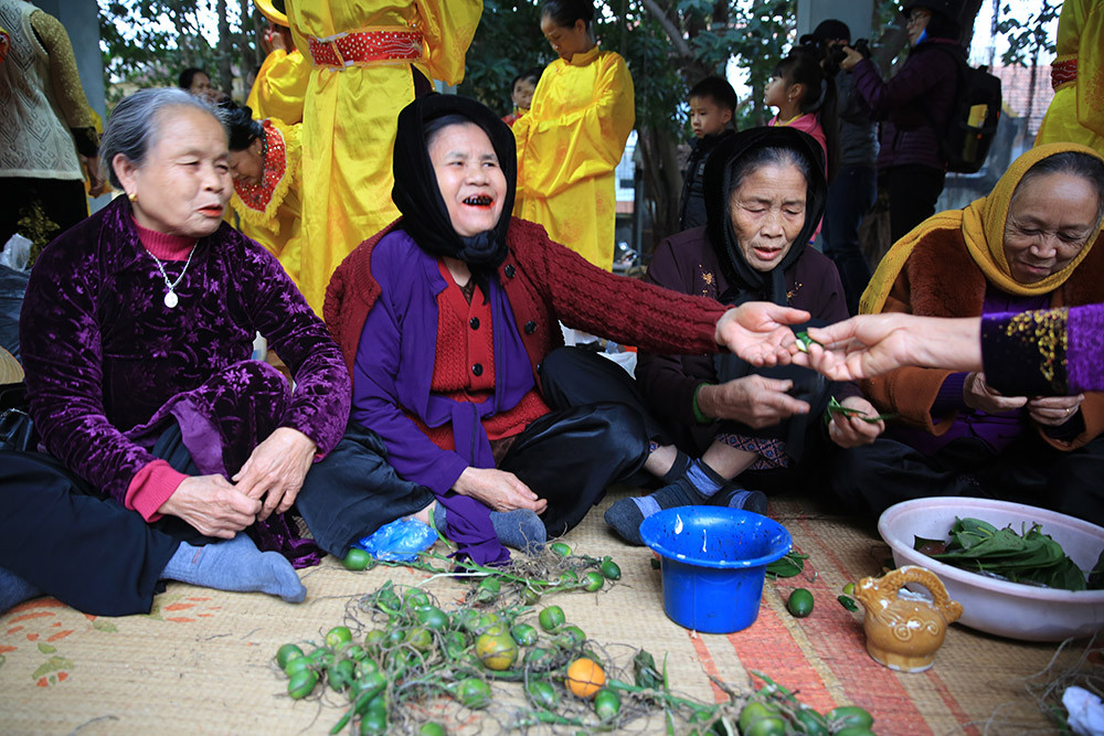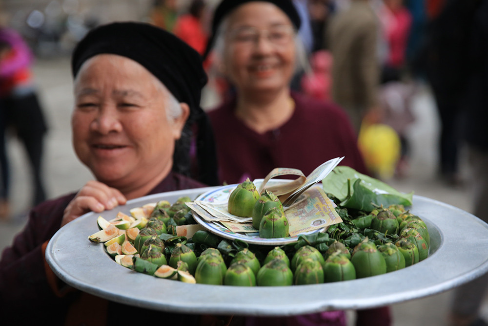 Các cụ bà vui vẻ mang những mâm trầu cau đi mời khách