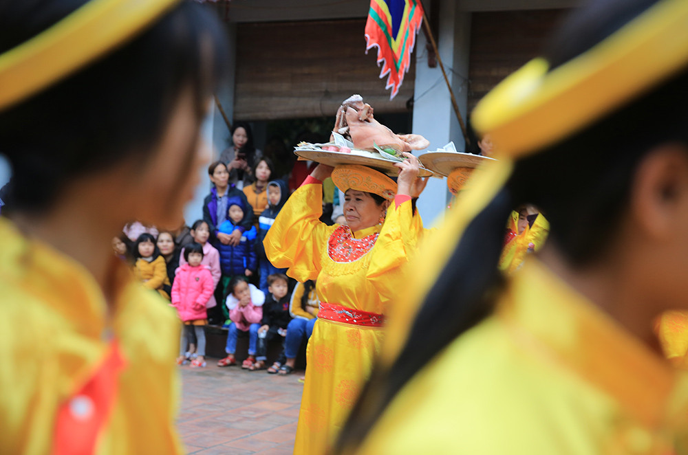 Trước khi màn trình diễn bắt đầu, đoàn rước dâng hương và lễ vật vào đền Thánh.