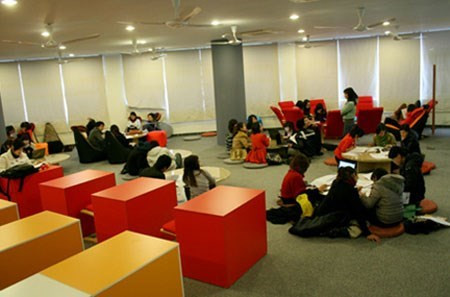 Đến đây, sinh viên có thể thoải mái lựa chọn phong cách học phù hợp với mình, khi có thể ngồi bệt dưới sàn nhà trải thảm, ngồi ghế êm hoặc nghiêm túc hơn là ngồi bàn học có vách ngăn riêng biệt.