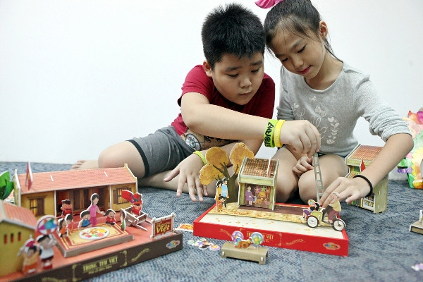 Hai bạn nhỏ cùng nhau lắp ráp mô hình “Mua sắm trung thu”