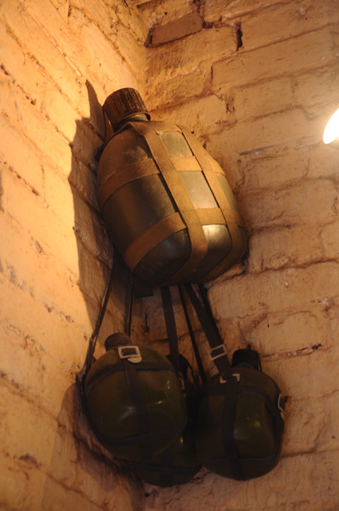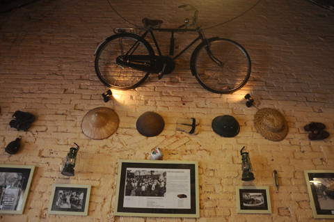 Câu khẩu hiệu và đồ vật thời chiến được treo trên tường gạch thô
