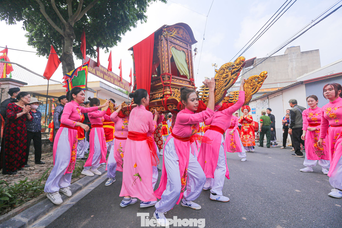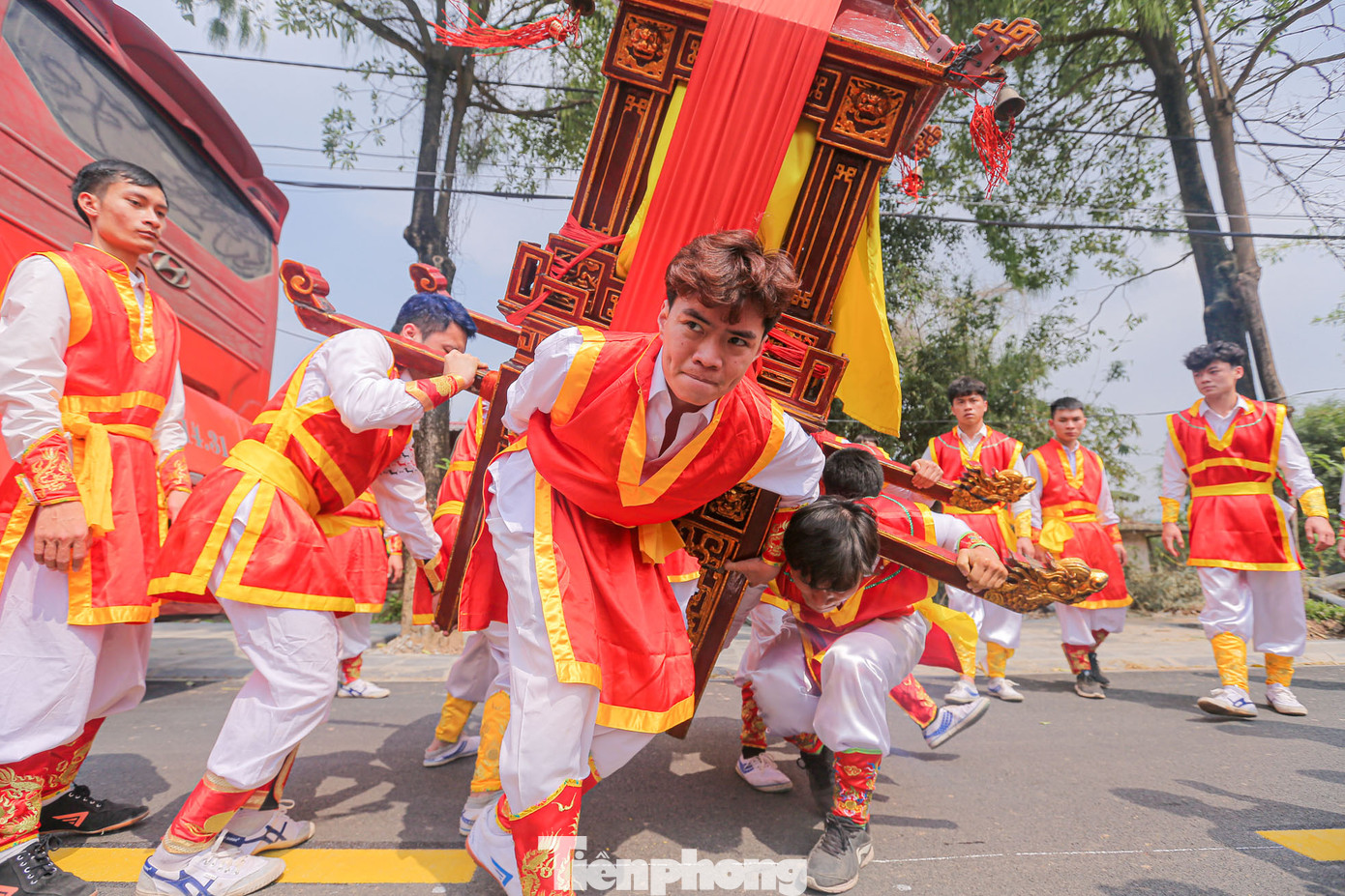 | Sau khi hành lễ tại đình làng, các kiệu lễ vật của các tổ dân phố thuộc làng Thổ Khối đi rước trước. |