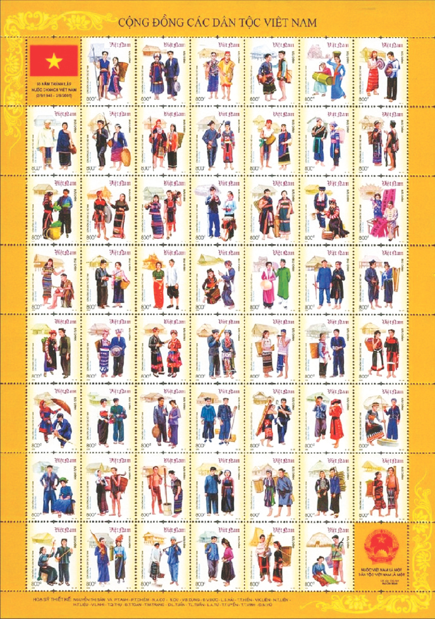Có thể nói, đây là bộ tem Quốc khánh cực kỳ độc đáo và ấn tượng. Bởi lẽ, tham gia thiết kế bộ tem có tới 22 họa sĩ. Cụ thể, với chủ đề “Cộng đồng các dân tộc Việt Nam”, các họa sĩ đã thiết kế 54 mẫu tem, qua đó giới thiệu trang phục của cộng đồng 54 dân tộc anh em. Hai góc của bộ tem là hình ảnh Quốc kỳ và Quốc huy nước CHXHCNVN. Bộ tem được in offet nhiều màu tại Công ty in tem Bưu điện… Bộ tem đã được ghi vào sách Kỷ lục Việt Nam với tư cách là bộ tem bưu chính lớn nhất, cũng là bộ tem đạt kỷ lục về số lượng họa sĩ tham gia thiết kế.