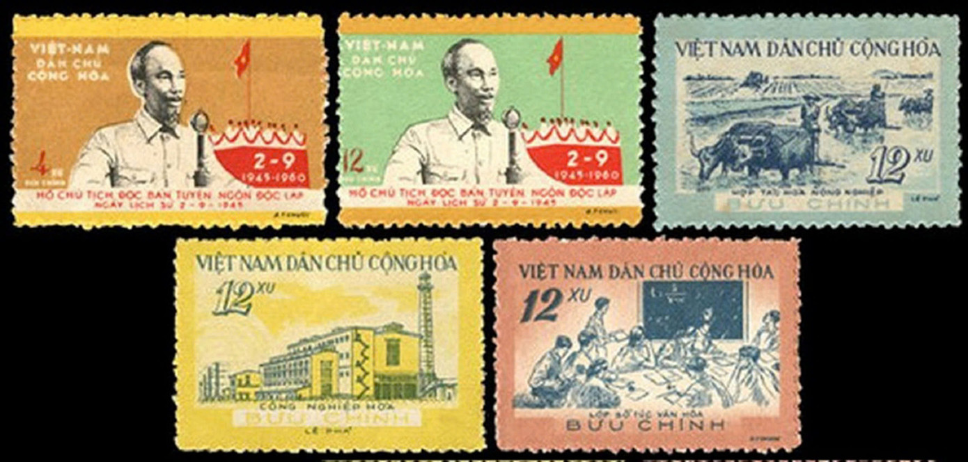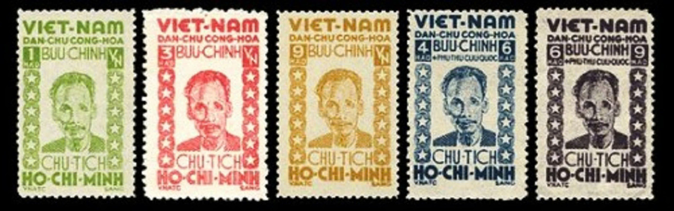 Bộ tem “Kỷ niệm lần thứ nhất Cách mạng Tháng Tám và ngày thành lập nước Việt Nam Dân chủ Cộng hòa (VNDCCH)” là bộ tem đầu tiên do chính quyền Cách mạng trực tiếp tổ chức thiết kế và phát hành. Bộ tem do danh họa Nguyễn Sáng thiết kế, gồm 5 mẫu, thể hiện chân dung Chủ tịch Hồ Chí Minh. Bộ tem chỉ in 1 màu, nhưng 5 mẫu tem là 5 màu khác nhau (xanh lá mạ, đỏ, vàng nghệ, xanh dương, tím). Bộ tem được in tại nhà in Việt Nam Ấn thư cục và phát hành đúng vào ngày 2/9/1946. Đáng lưu ý, bộ tem Quốc khánh 2-9 còn mang dấu ấn của thời kỳ chuẩn bị toàn quốc kháng chiến với việc tem có “phụ thu cứu quốc”.
