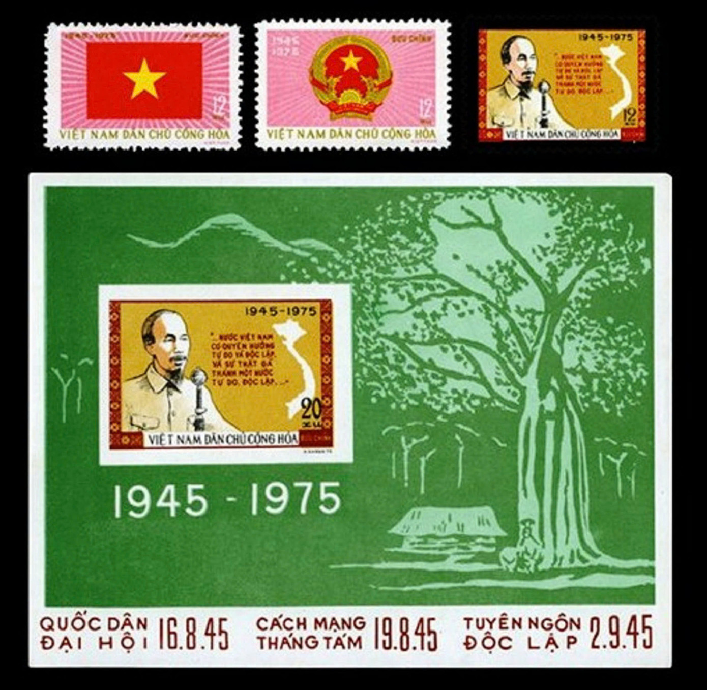 Tuy nhiên, do hoàn cảnh chiến tranh, 15 năm sau (1975) khi đất nước thống nhất, bộ tem Quốc khánh 2-9 mới tiếp tục được phát hành. Đây là bộ tem Quốc khánh thứ 4 và cũng là bộ tem đầu tiên của nước Việt Nam thống nhất. Bộ tem do 2 họa sĩ Đỗ Việt Tuấn và Trần Huy Khánh thiết kế, gồm 3 mẫu tem và 1 block. Trong đó, 2 mẫu tem 878, 879 do họa sĩ Đỗ Việt Tuấn thiết kế, còn mẫu tem 880 do họa sĩ Trần Huy Khánh thiết kế. Cụ thể, 2 mẫu tem 878, 879 là hình ảnh Quốc kỳ và Quốc huy của nước VNDCCH; còn mẫu tem 880 là hình ảnh Chủ tịch Hồ Chí Minh đọc Tuyên ngôn Độc lập; cùng một trích đoạn trong Tuyên ngôn và bản đồ hình chữ S… Mỗi mẫu tem được thiết kế theo bố cục hình chữ nhật nằm. Riêng block, hình ảnh được thiết kế liên quan đến 3 sự kiện: Quốc dân đại hội; Cách mạng tháng Tám; Tuyên ngôn Độc lập. Block được thiết kế theo bố cục hình chữ nhật nằm. Toàn bộ 3 mẫu tem và block được in offset nhiều màu tại nhà in Tiến Bộ.