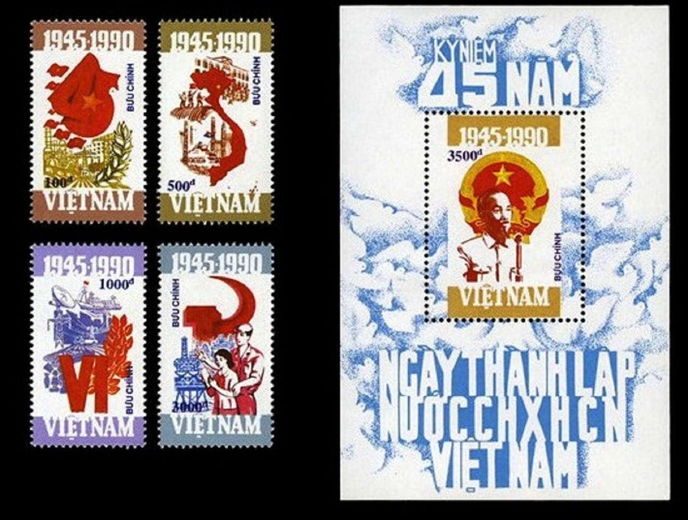 Trong số 4 bộ tem nói trên, bộ tem “Kỷ niệm 45 năm ngày thành lập nước CHXHCN Việt Nam” là bộ tem được thiết kế đặc sắc, ấn tượng nhất. Bộ tem do họa sĩ Trần Thế Vinh thiết kế, gồm có 4 mẫu và 1 block. Bốn mẫu tem và block được thiết kế theo bố cục hình chữ nhật đứng. Hình ảnh của 4 mẫu tem Quốc khánh là 4 chủ đề: 40 năm xây dựng đất nước; Hợp tác hữu nghị, bảo vệ hòa bình; Bảo vệ Tổ quốc; Dưới sự lãnh đạo của Đảng và Bác Hồ.