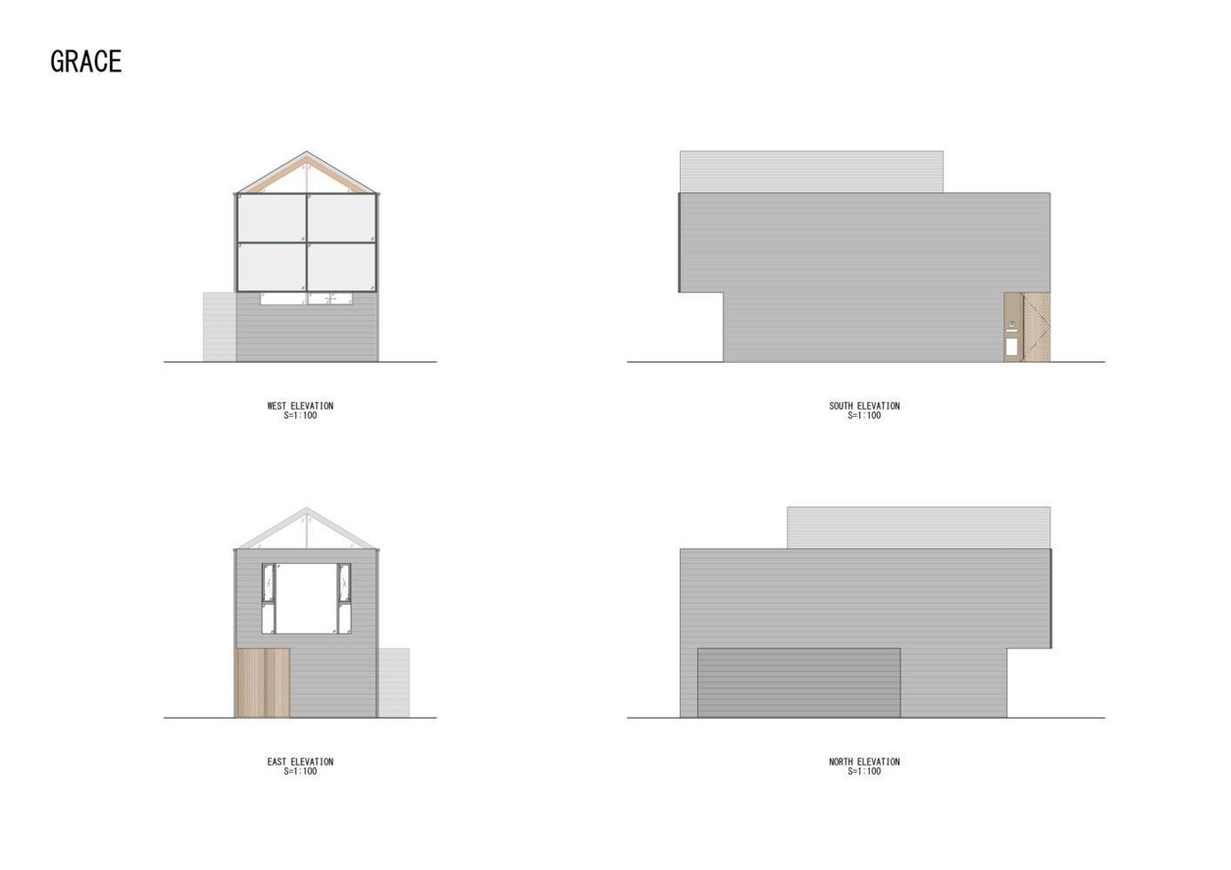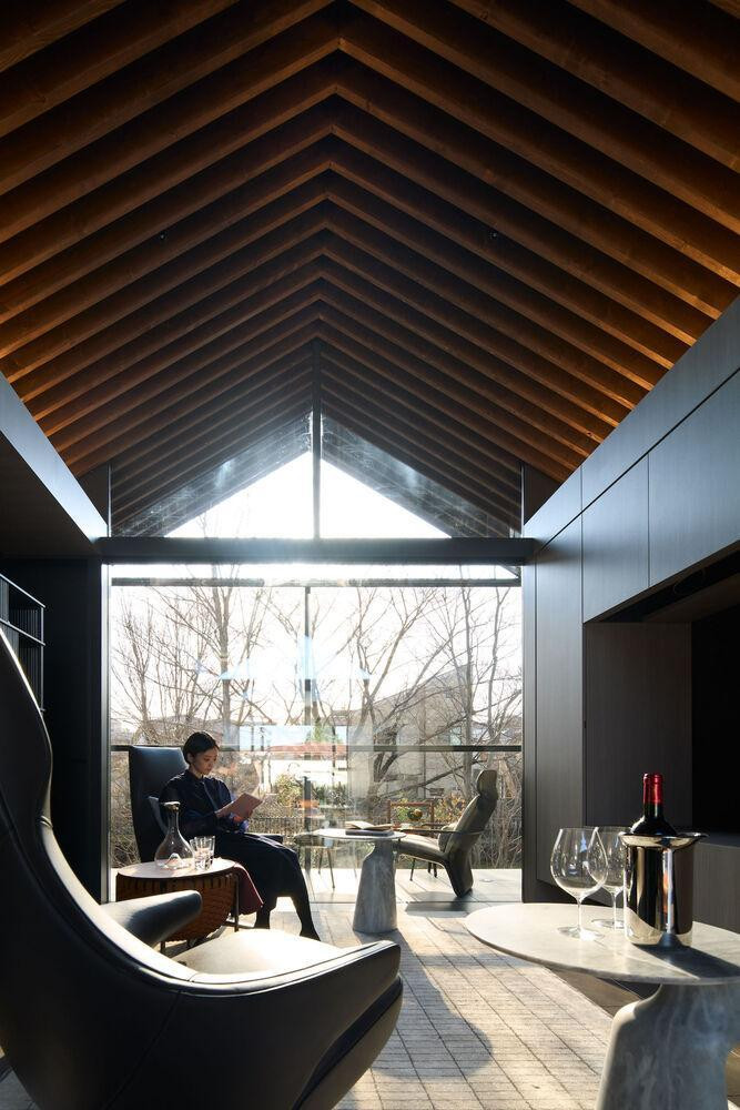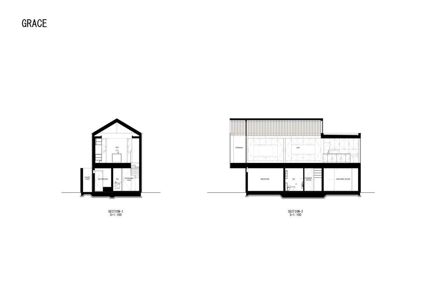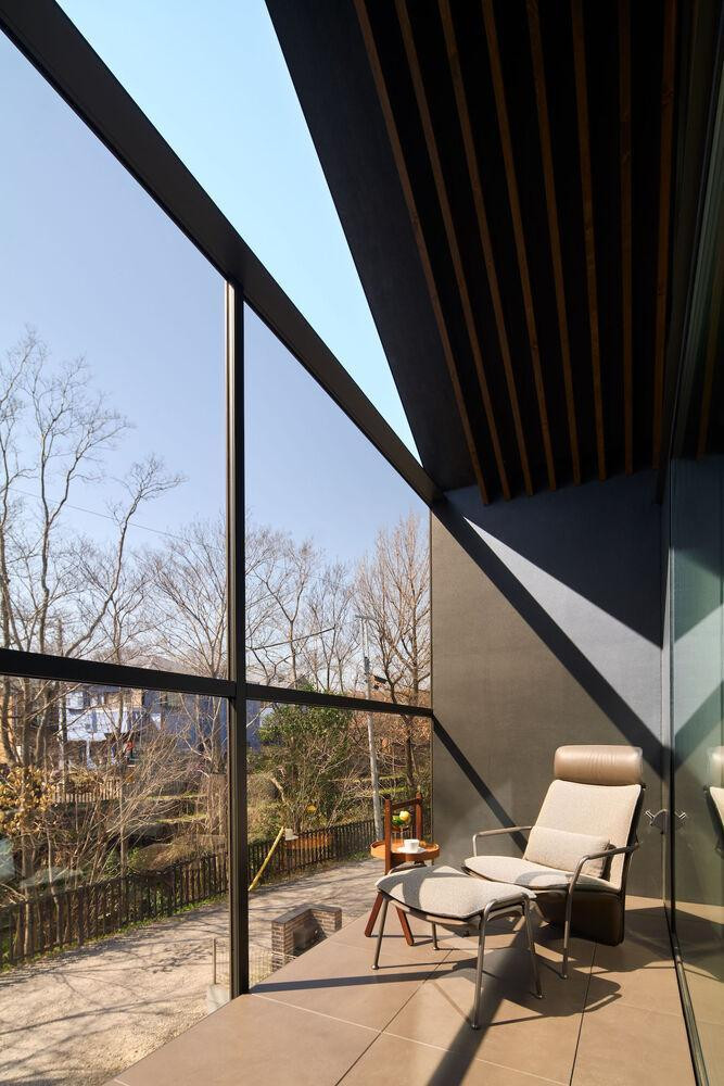 Điểm nhấn của ngôi nhà là không gian phòng khách mở ở tầng 2 có mái đầu hồi với xà nhà lộ ra ngoài. Phần ban công phía trước sử dụng toàn bộ kính một chiều để người trong nhà có thể hướng tầm nhìn ra ngoài cũng như cho phép khung cảnh thiên nhiên bên ngoài ẩn hiện vào trong nhà.
