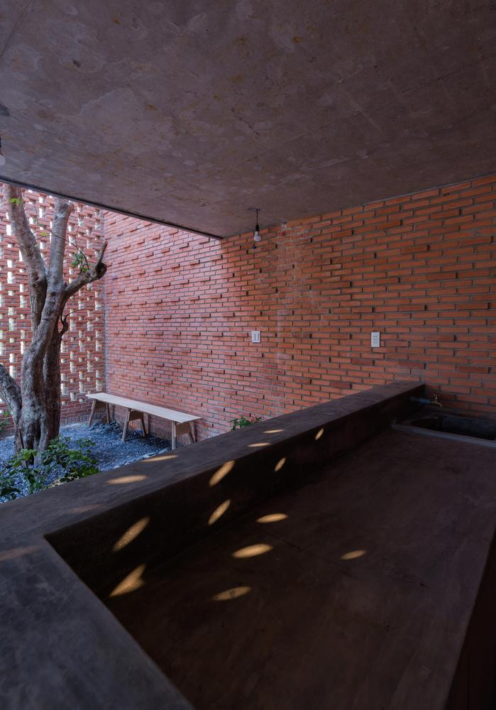 | Từ đó, ngôi nhà chỉ sử dụng duy nhất gạch ống để xây dựng cũng như làm mặt tiền rộng 108m2 đã ra đời trong khu dân cư mới ở huyện Long Thành (Đồng Nai).  | | Để tiết kiệm được nhiều chi phí nhất có thể, hai vợ chồng đã mua nguyên vật liệu để tự làm tất cả đồ nội thất. |  |  | | Sân trước và sân sau được bao bọc bởi các bức tường hở được xây bằng gạch ống xen kẽ, tạo ra các ô thoáng, hình thành không gian đệm để giảm sức nóng từ môi trường bên ngoài vào nhà.  | | Trong đó sân trước là khu vực thư giãn như uống cà phê buổi sáng. Đây là nơi mà gió, ánh sáng mặt trời và bóng của các bức tường gạch gặp nhau. |  |  | | Tầng 1 là không gian đa chức năng, vừa dùng để tụ tập bạn bè, vừa dùng để mở quán cà phê nhỏ sau này. |  | | Tầng lửng là không gian của gia đình bao gồm hai phòng ngủ (một cho hai vợ chồng, một cho đứa con trong tương lai), bếp và bàn ăn. |  | | Lối đi nhỏ trong nhà giúp cho người ở cảm nhận được hướng gió và chạm vào bóng râm cũng như ánh sáng mặt trời khi họ di chuyển từ tầng trệt lên cầu thang. |  | | Đây là một mẫu nhà giá rẻ được nhiều kiến trúc sư trên thế giới khen ngợi.  | | Bởi nó đáp ứng được nhu cầu về không gian sống đẹp và thú vị cho người lao động thu nhập trung bình và thấp trên khắp nước ta.  | | Bản vẽ thiết kế của ngồi nhà. | | | | | |