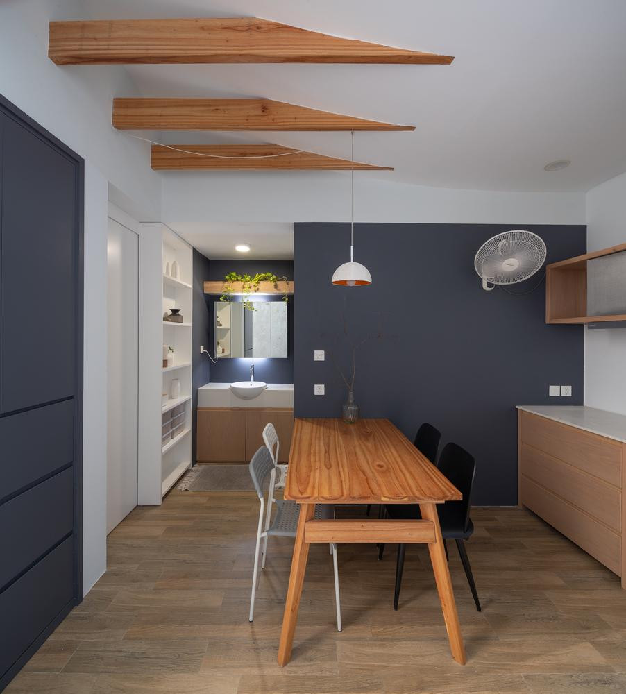 | Kiến trúc sư đề xuất gia chủ lựa chọn nội thất trong nhà theo tông màu chủ đạo là trắng, xám và đen. Đồng thời, để không gian có điểm nhấn và sự ấm cúng giữa một loạt gam màu lạnh, các bàn, kệ, tủ trong nhà ưu tiên làm bằng gỗ. |