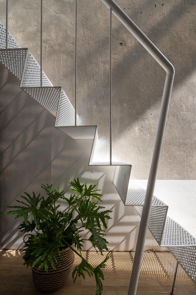 | Kiến trúc sư sử dụng cầu thang sắt lỗ để kết nối tầng trệt với tầng 2 mà không làm cản trở tầm nhìn và đường đi của ánh sáng trong nhà vào ban ngày. |