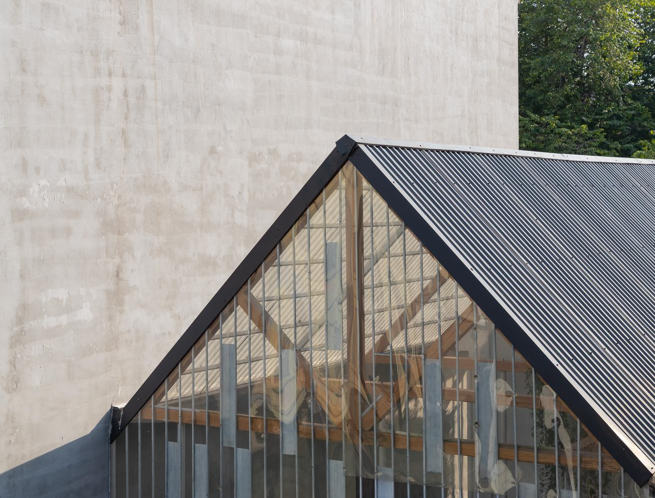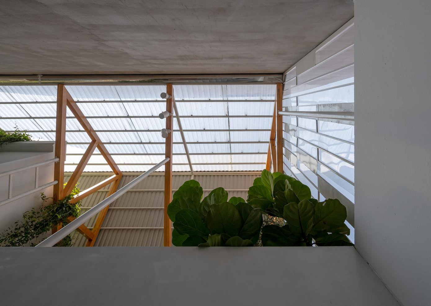 | Một nửa mái chéo được làm bằng polycarbonate dạng sóng trong để tăng ánh sáng cho không gian xanh và cũng làm cho khoảng sân áp mái trông lớn hơn. |