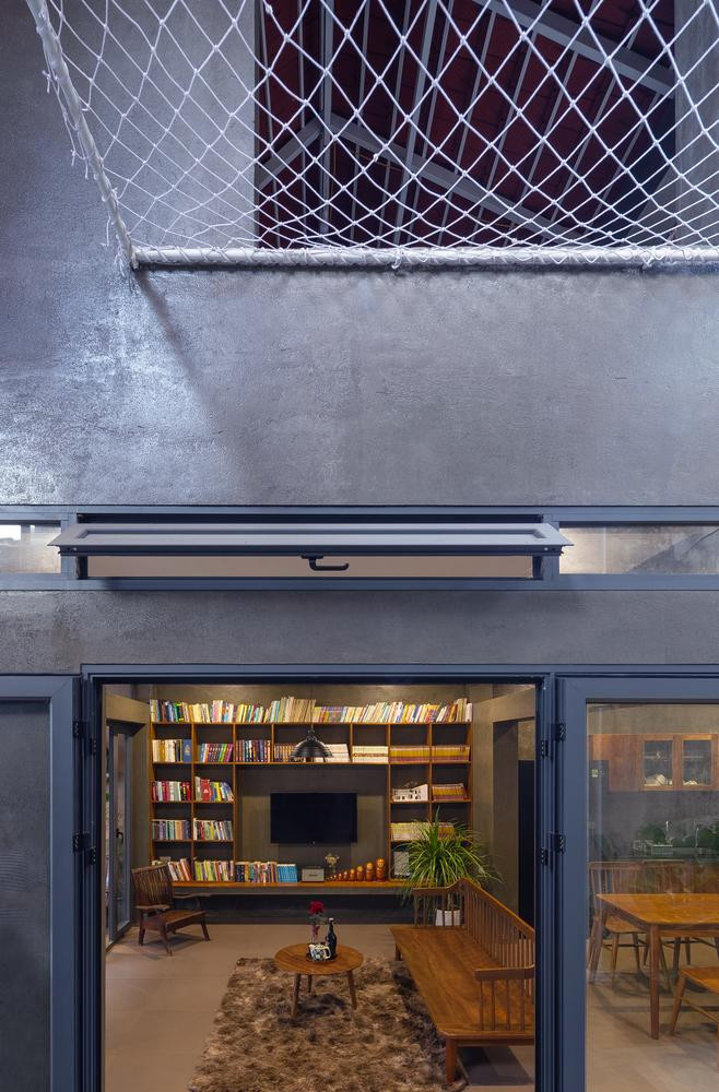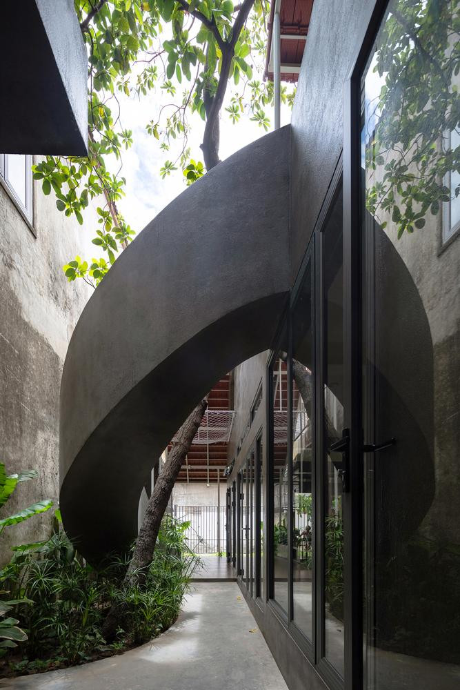 | Đồng thời, khi thi công, nhóm thiết kế đã quyết định giữ lại một cây xanh lớn bên trong nhà. Cây lớn này trở thành điểm nhấn cho khu vườn nhỏ trong sân, với cầu thang xoắn ốc ôm lấy cây, kết nối không gian giữa sân trên và sân dưới của ngôi nhà. |