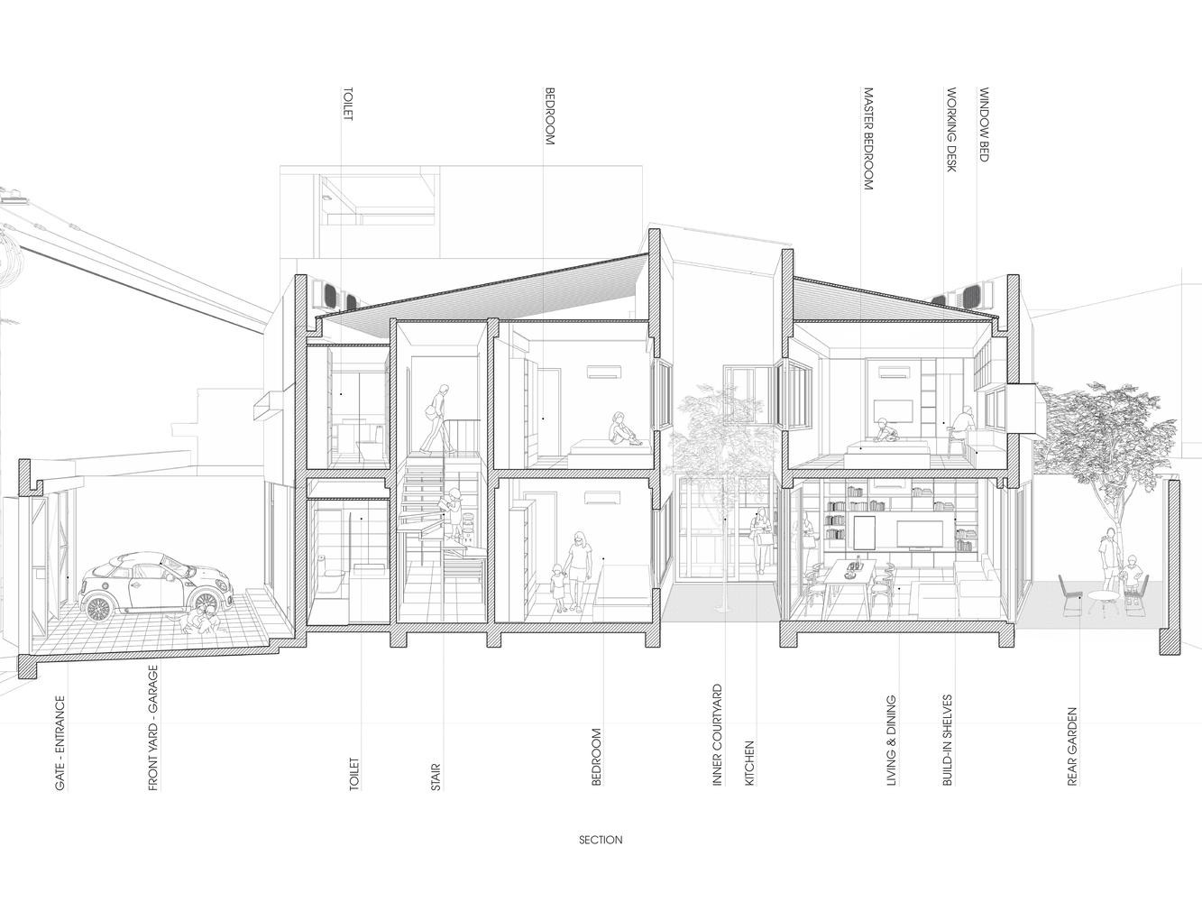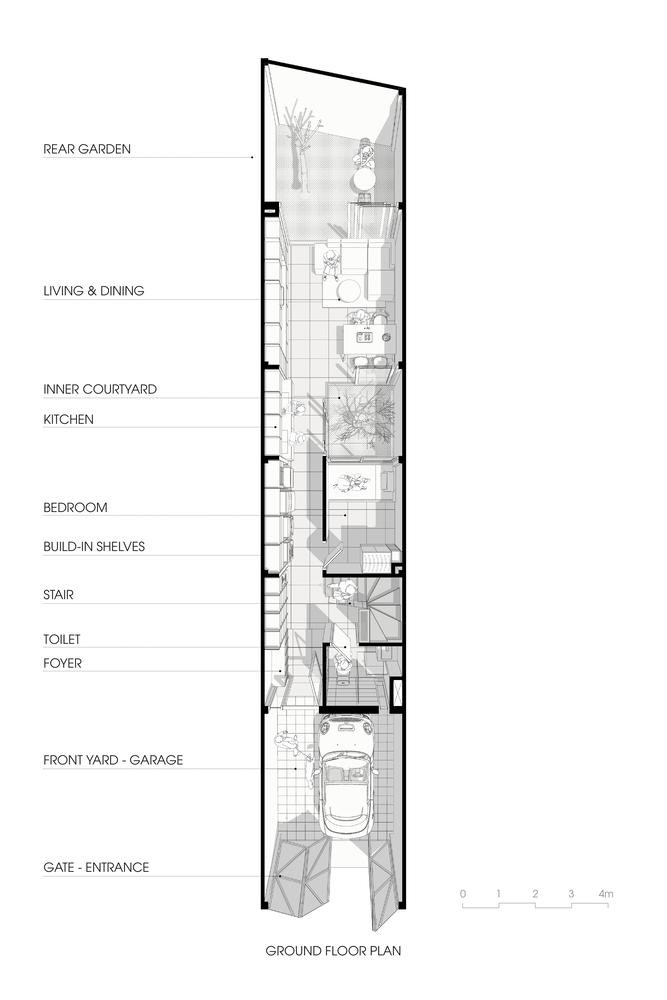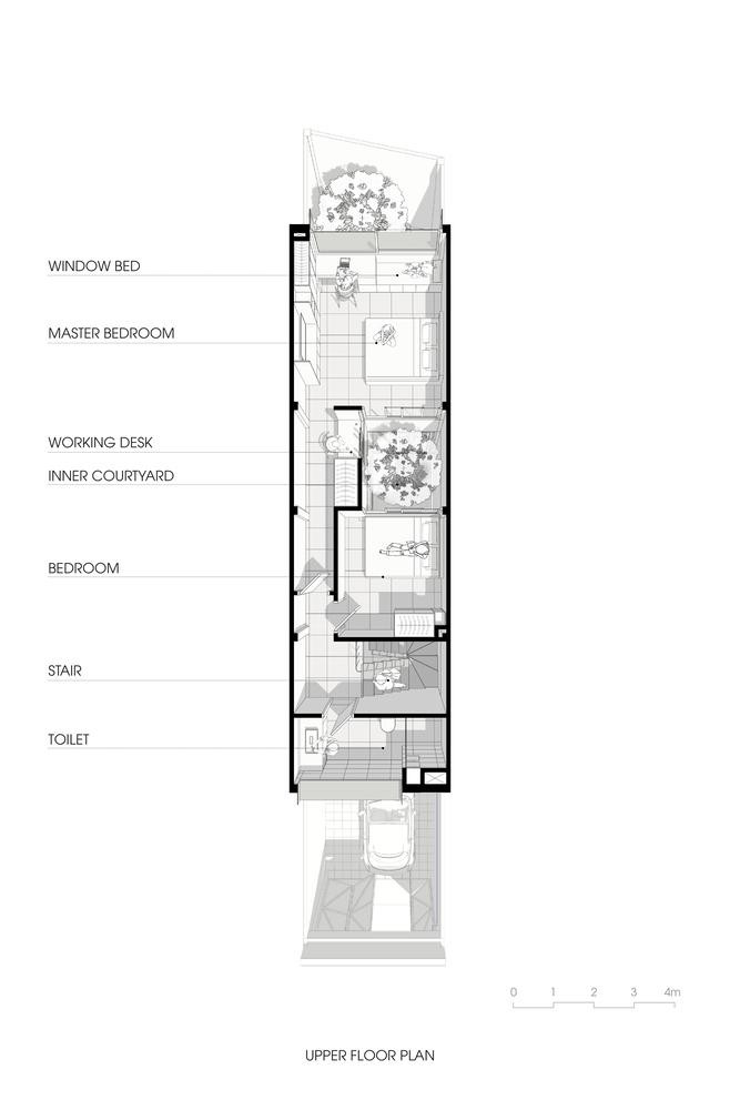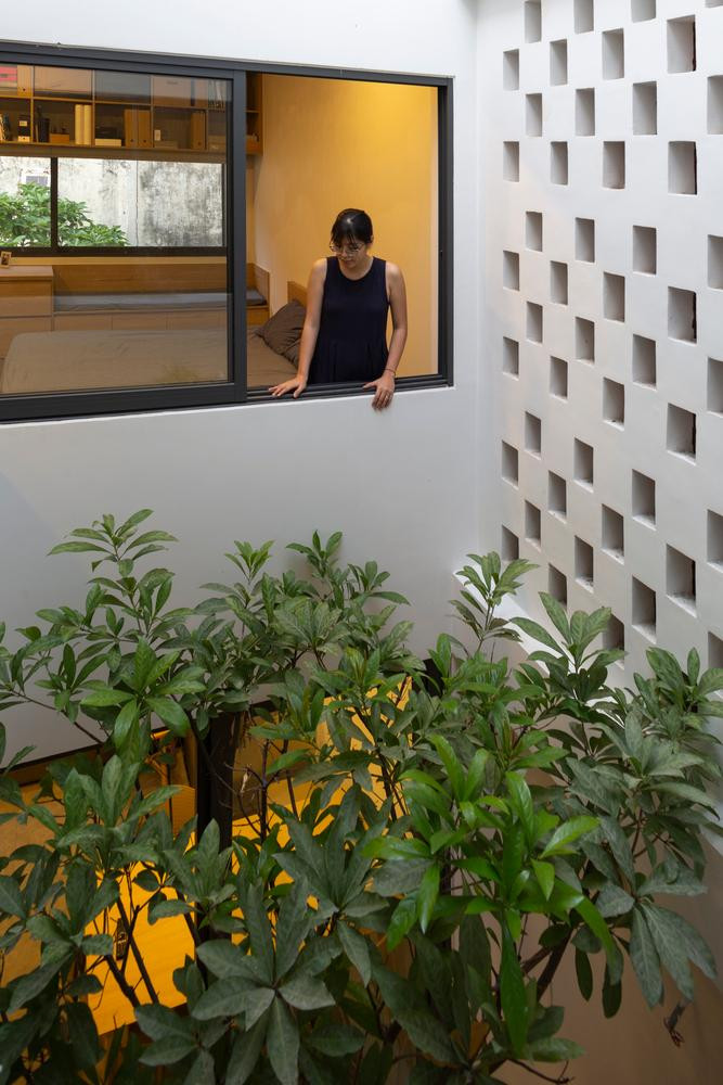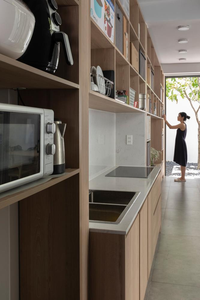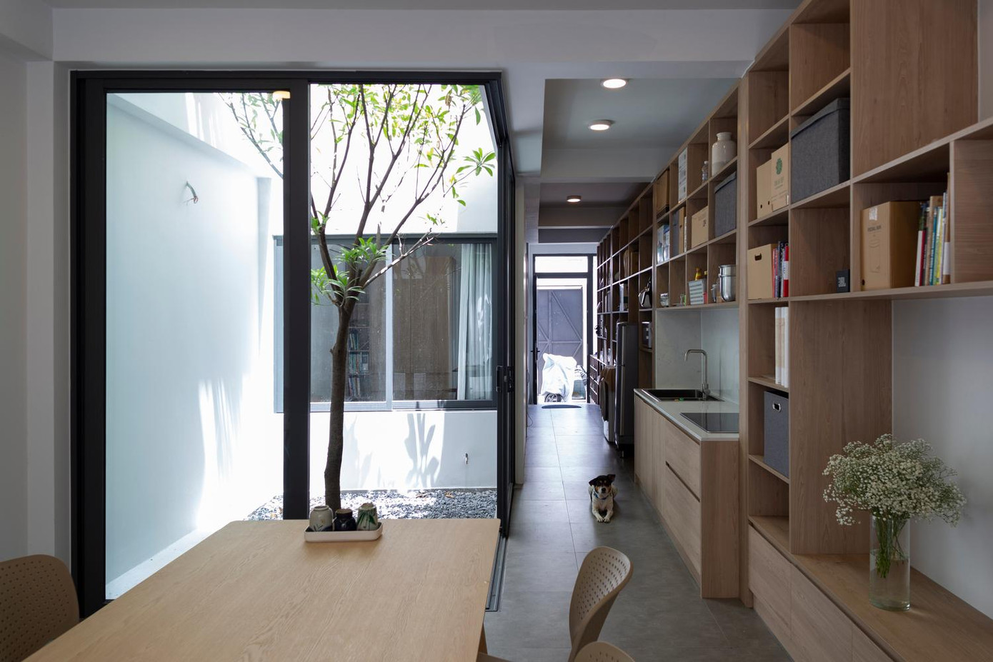 | Thành phố Hồ Chí Minh là một trong những đô thị đông dân nhất của Đông Nam Á nên cuộc sống vô cùng bộn bề, ngột ngạt cũng như tù túng. Hơn nữa, thành phố này cũng đang diễn ra làn sóng COVID -19 lần thứ 5 vô cùng nguy hiểm với hàng nghìn ca mắc mỗi ngày. Do đó mọi người thường phải làm việc online tại nhà, nếu không muốn nói là bị “mắc kẹt” ở nhà. Vì thế một nhóm kiến trúc sư đã thực hiện ý tưởng làm ngôi nhà với không gian ở thành nơi làm việc để ứng phó với đại dịch.  | | Các kiến trúc sư mong muốn ngôi nhà giúp các thành viên trong gia đình có cơ hội sống chậm lại để trải nghiệm không gian. Đồng thời nó phải đảm bảo tiết kiệm ngân sách với giá cả phải chăng và thi công trong thời gian ngắn nên thiết kế cực kỳ tối giản và đơn giản. |  |  | | Trong nhà, không có ranh giới cụ thể giữa các không gian vì phòng bếp chính là phòng ăn, phòng ngủ cũng là nơi làm việc. Việc sử dụng kết hợp không gian được thể hiện dọc theo hành lang chính, nơi có một kệ tủ lớn và dài 14 mét gắn vào tường.  | | Chiếc kệ này kéo dài, được sử dụng cho nhiều mục đích, là nơi để các vật dụng gia đình như nhà bếp, tủ đựng thức ăn, thiết bị, tủ lạnh, máy giặt, kệ giày dép, kệ sách,…Mọi thứ được sắp xếp và lấp đầy trong một cấu trúc có trật tự tạo nên sự đa dạng và linh hoạt. |  | | Không giống như nhà phố điển hình ở TP Hồ Chí Minh, ngôi nhà không mở ra bên ngoài mà hướng vào bên trong, Hai mặt tiền đơn giản hết sức có thể vì cả mặt trước và mặt sau chỉ có một khoảng hở “vừa đủ” đón ánh sáng ban ngày và thông gió, tránh ồn và ô nhiễm không khí cũng như duy trì sự riêng tư và thân mật của gia chủ. |  | | Ngôi nhà dành cho người hướng nội nên được thiết kế để nhìn từ trong ra ngoài và nhận được năng lượng từ sự phản chiếu bên trong. Các cửa trượt đều làm bằng kính để tăng sự rộng rãi cho không gian cũng như ánh sáng cho cả ngôi nhà.  | | Cầu thang và nhà vệ sinh được bố trí ở phía trước nhà, sân trong nằm ở trung tâm của ngôi nhà. | |  |  | | Còn bếp, phòng khách và các phòng ngủ được bố trí phía sau ở hai bên sân trong, tạo sự thông thoáng và đón nhận ánh sáng cho cả ngôi nhà. | | | |
