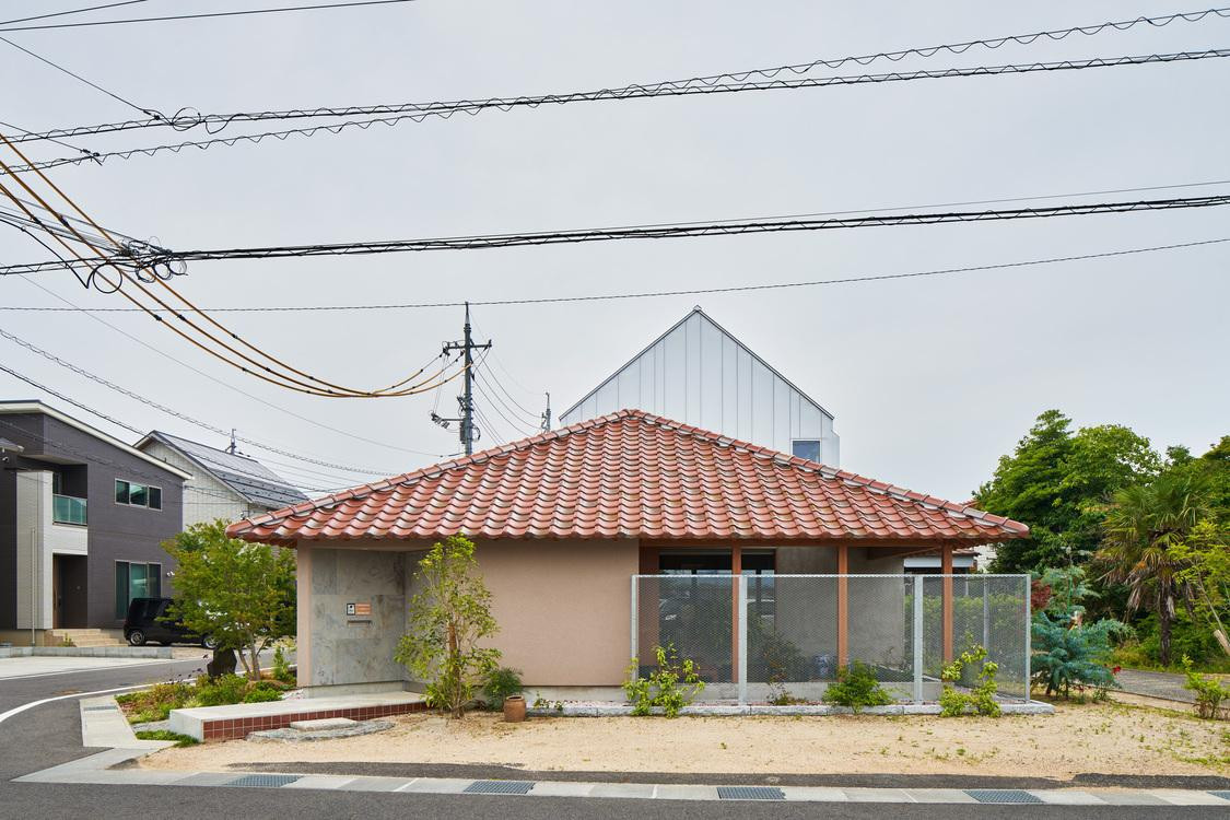 | Phần mái của tầng 1 lợp bằng ngói Sekishu màu nâu đỏ truyền thống. |