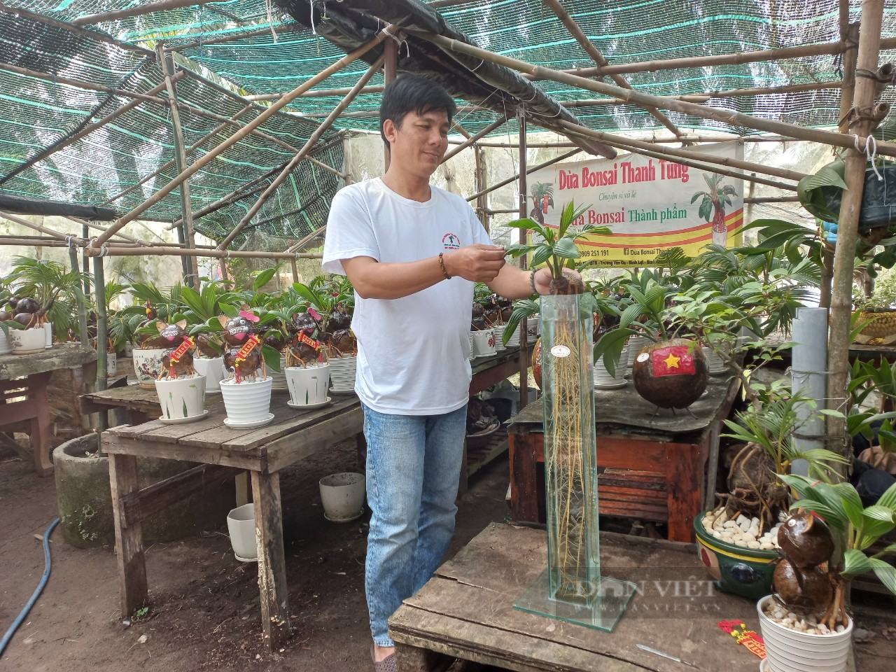 Giá chậu bonsai dừa thủy canh có bộ rễ dài cả mét này được anh Tùng bán với giá 2 triệu đồng cho mùa Tết năm nay. Nhiều khách hàng đang thích thú với cây dừa đặc biệt này của anh Đậu Thanh Tùng.