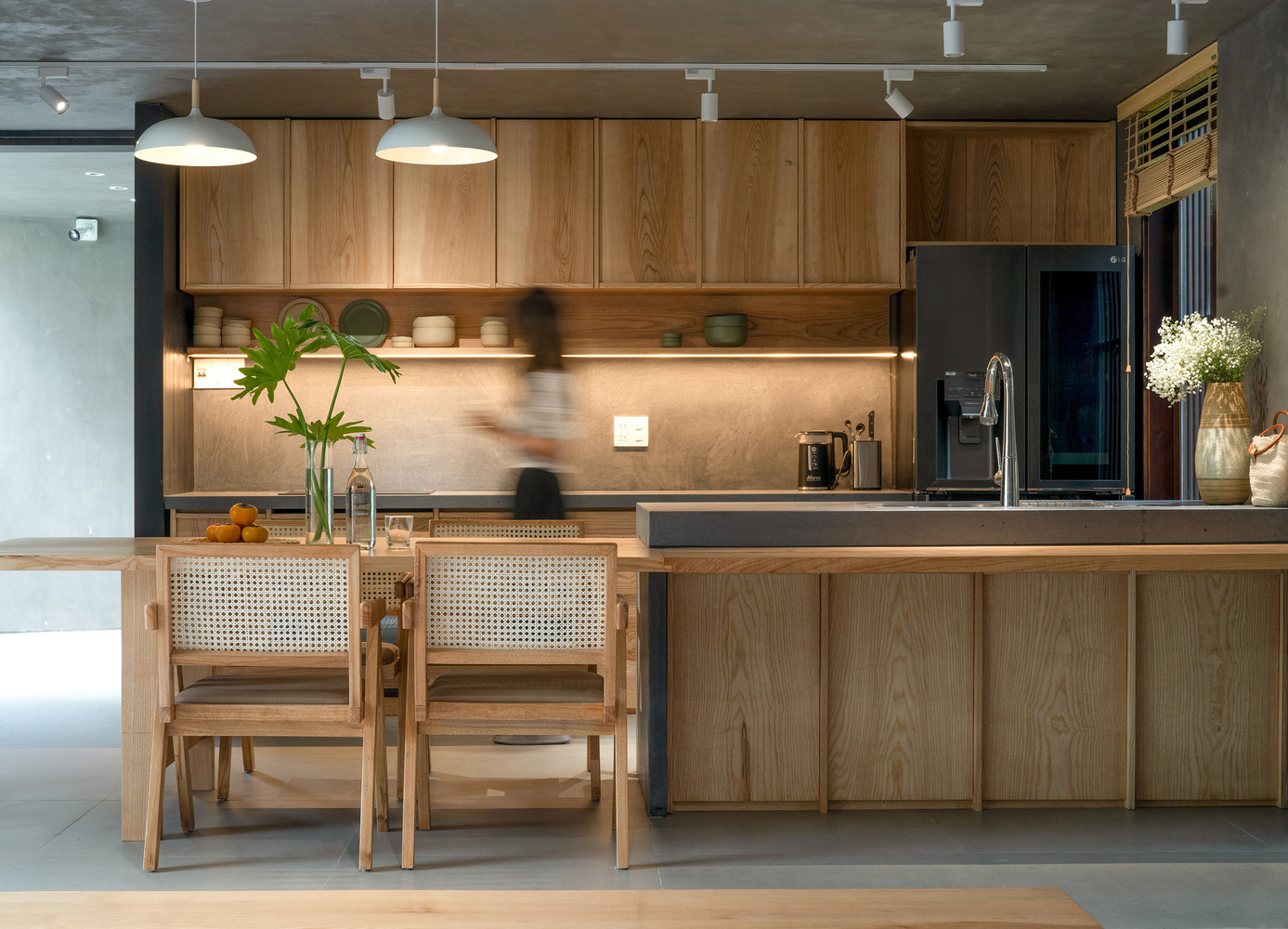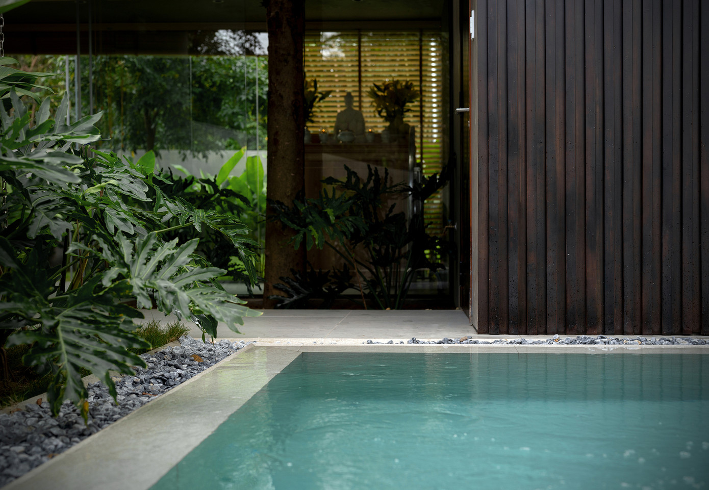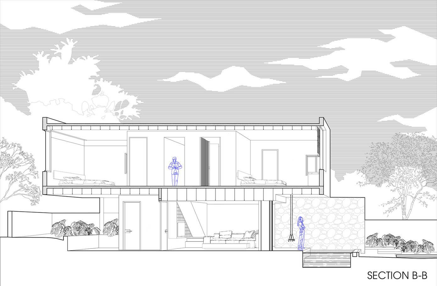 | KTS sử dụng kỹ thuật tương phản rắn - rỗng để xây dựng công trình, theo đó tầng trệt được thiết kế thông thoáng nhất có thể, kết nối cảnh quan trước sau, đồng thời đề cao yếu tố tự nhiên và thông gió. Tầng còn lại là một khối vững chắc với các cửa sổ được thiết kế có mục đích. |