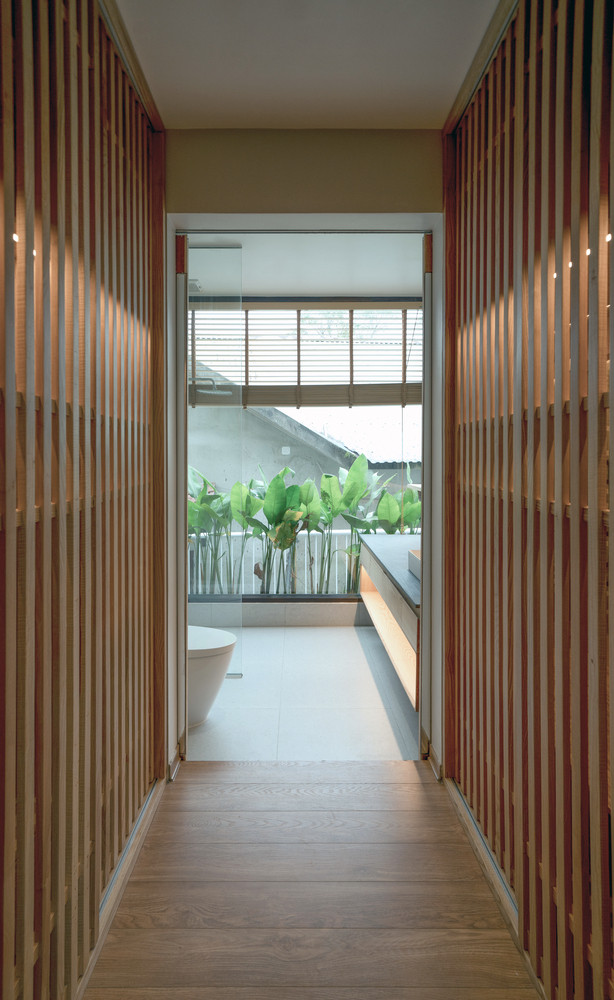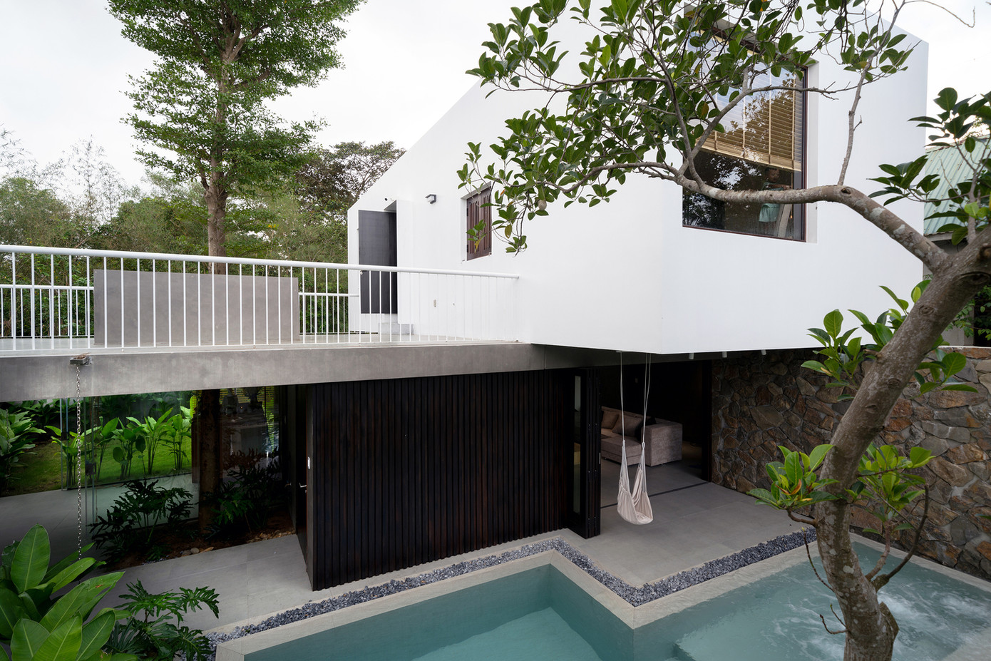 | Với kết cấu dầm console vươn ra 2,5m, khối phòng ngủ phía trên trở thành mái hiên lớn che mát cho khu vực tầng trệt. Mái hiên là một yếu tố vô cùng quan trọng trong kiến trúc nhiệt đới, nó giúp cản nắng nóng chiếu vào cũng như mưa vào mùa đông trực tiếp vào nhà. |
