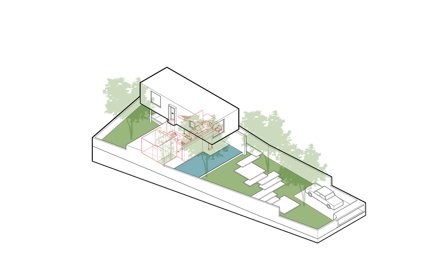 | Khu đất xây dựng công trình có tổng diện tích gần 450m2 nhưng KTS chỉ xây dựng ngôi nhà với tổng diện tích sàn là 180m2 (tầng trệt chỉ 80m2). Phần còn lại làm không gian cho cảnh quan, bể bơi và vườn cây. |