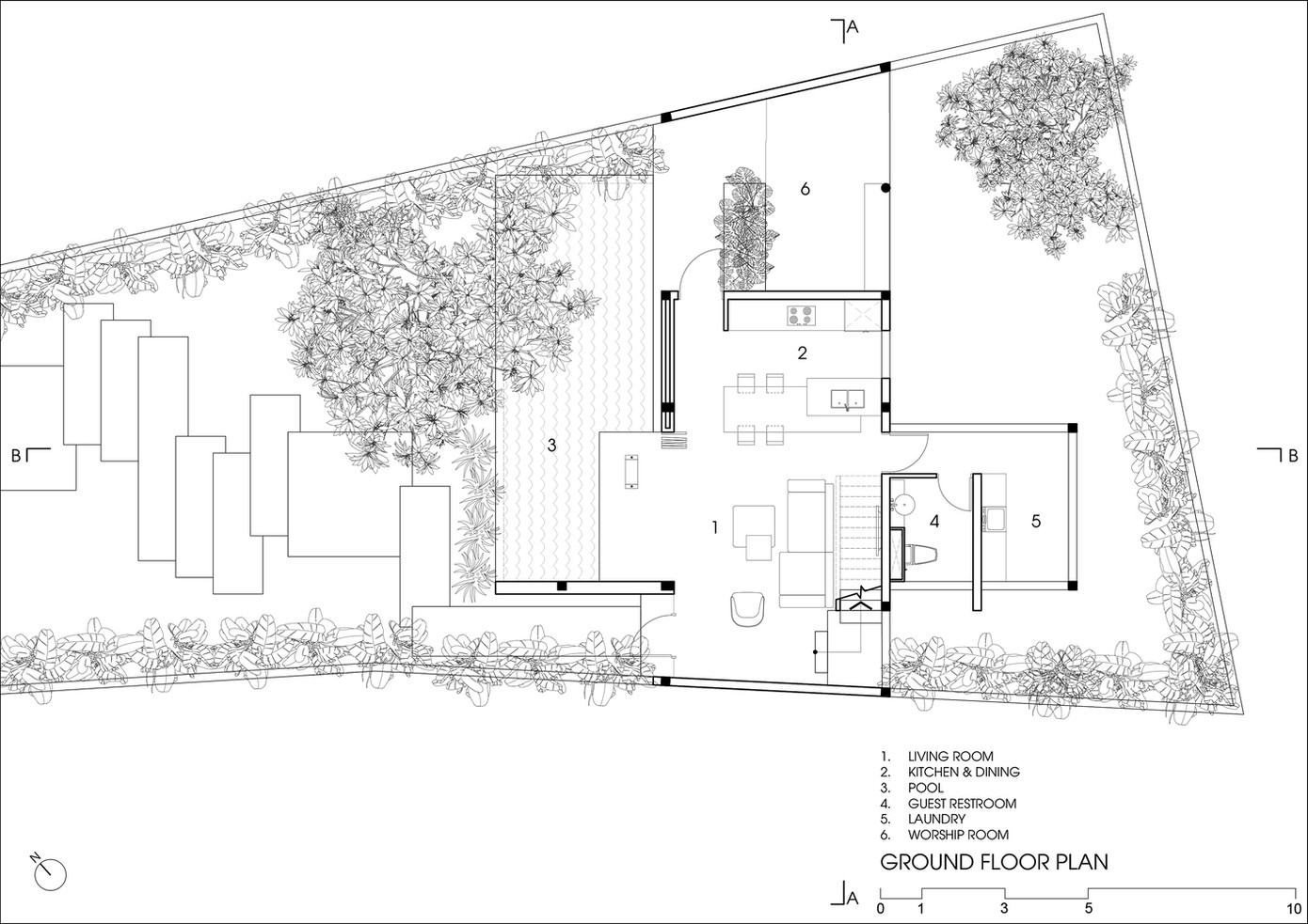 | Mặt bằng tầng 1 được thiết kế với hình thức đơn giản nhất có thể, là phần nối tiếp theo chiều ngang từ tường rào, kéo dài theo chiều ngang khu đất, chia sân vườn thành 2 phần: Khu phía trước là lối vào với bãi đậu xe, bể bơi, tiệc ngoài trời. Diện tích phía sau là vườn trồng rau và cây ăn trái. |