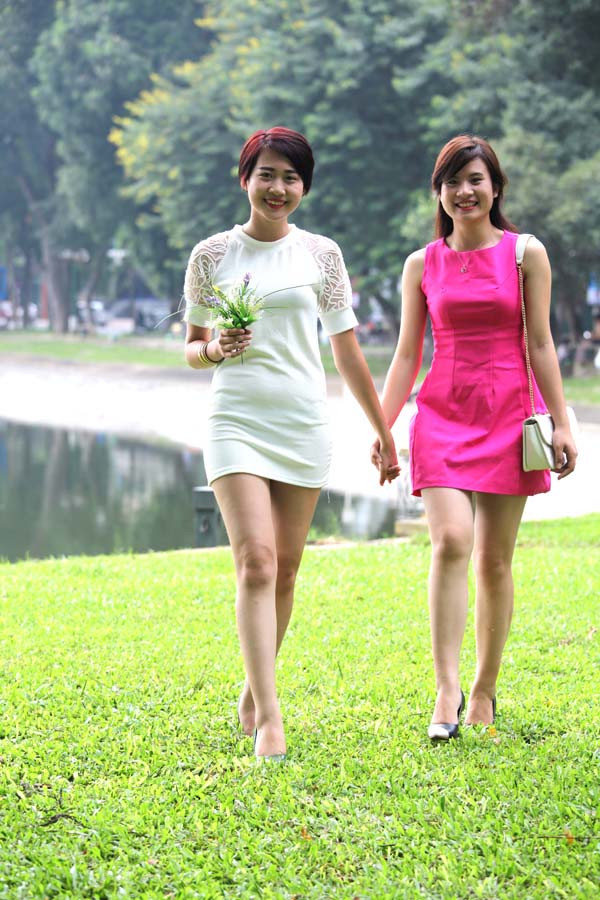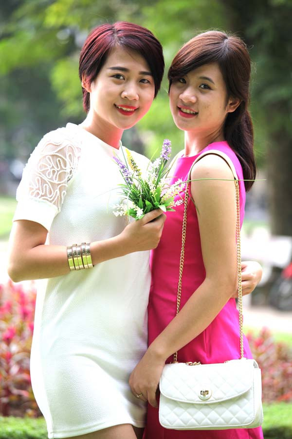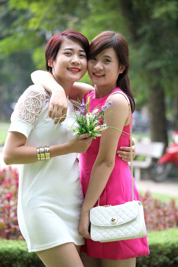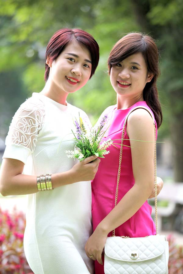 Việt Trinh và Diệu Linh (váy đỏ) là đôi bạn thân.