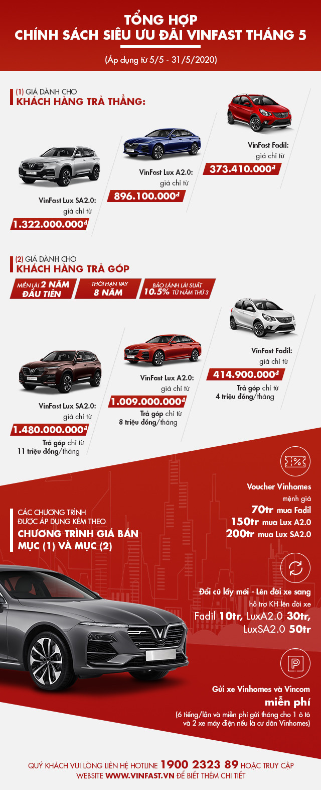 Ngoài mức giá siêu ưu đãi đặc biệt chỉ áp dụng trong tháng 5, thấp hơn so với giá niêm yết tới gần 300 triệu đồng, VinFast còn vừa tung ra chương trình Đổi cũ lấy mới, hỗ trợ người tiêu dùng chuyển từ xe cũ sang xe VinFast. Chương trình này được áp dụng chung với tất cả ưu đãi hiện có của VinFast, mang đến cơ hội sở hữu xe Việt không thể hấp dẫn hơn cho người tiêu dùng Việt.