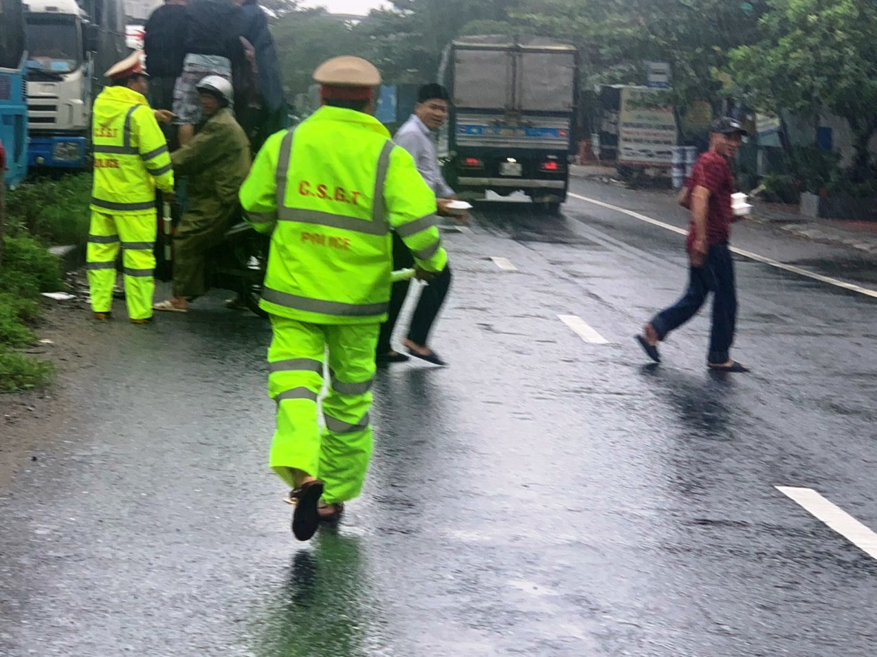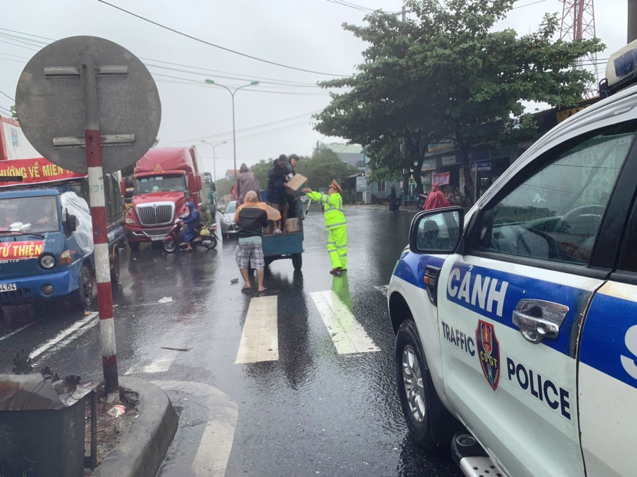 Lực lượng CSGT vừa đội mưa bão làm nhiệm vụ điều tiết lưu thông, vừa tích cực cứu trợ, tiếp tế đồ ăn, nước uống cho đồng bào bị mắc kẹt do mưa bão.
